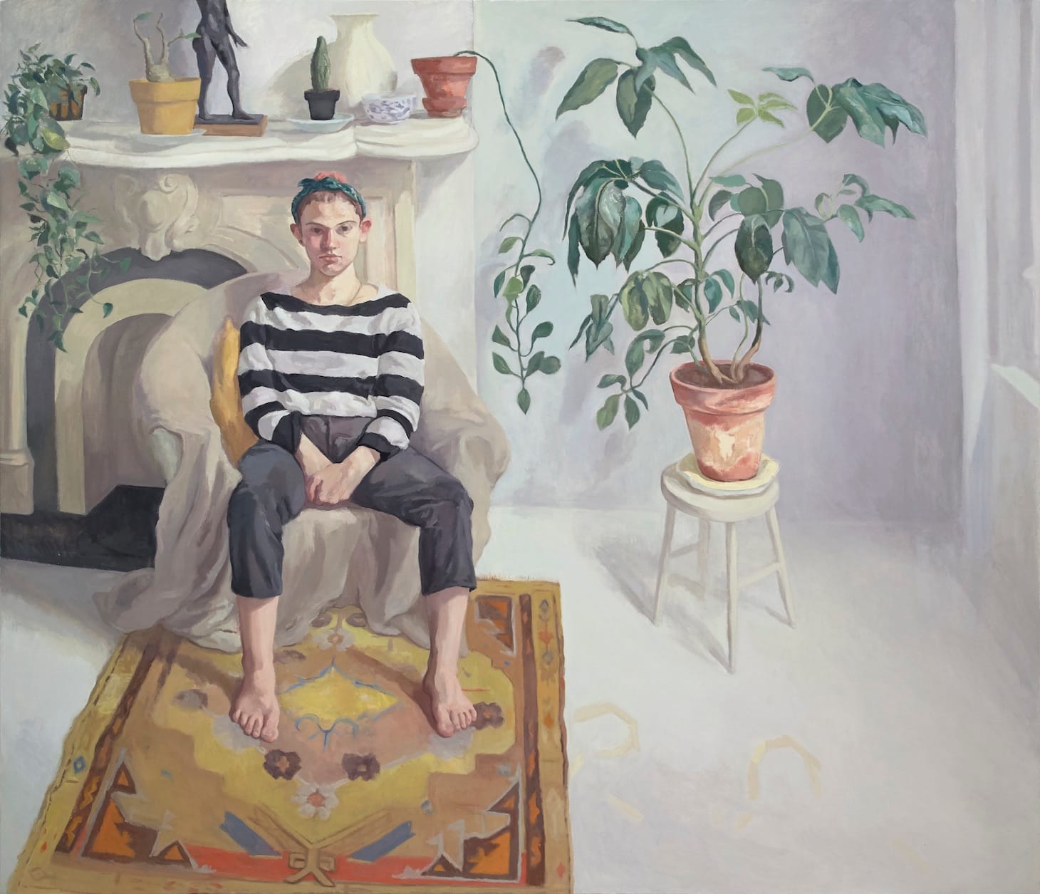 Bailey’s attention to the setting makes it more than just a backdrop. In the masterful “Alex and Umbrella Plant (Early Version)” (oil on linen, 62 by 82 inches, 2020), which the artist told me she made after COVID-19 quarantine orders were in place, the window has been opened. Alex is sitting in a chair on the left side of the painting, just to the right of the fireplace. The chair has been covered with a tan-gray cloth. They wear a pullover with horizontal blue and white stripes and dark gray pants, their bare feet firmly planted on a tan and umber rug with shapes in soft red and blue hues. The small rug sets Alex off from the right side of the painting, which is occupied by a large umbrella plant placed on a white stool, on a white floor.