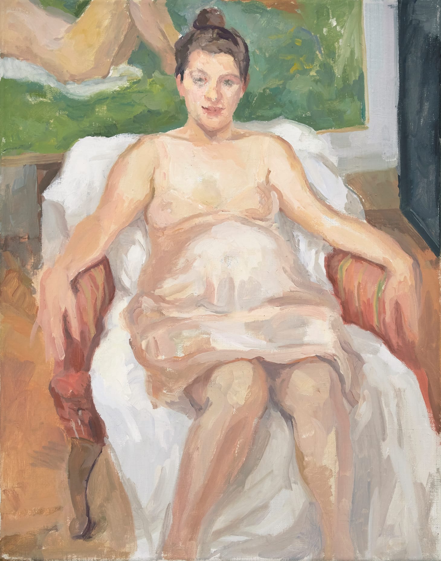 The setting is late realist painter Lennart Anderson’s studio. The all-over light seems to come from above, most likely a skylight. Anderson’s daughter, Jeanette, who is pregnant, is seated in a red chair partially covered by a white sheet. Behind her part of a painting by Lennart is on the wall — a cropped view of nude lying on green grass. The bright, glowing light — which seems to be celebrating Jeanette’s pregnancy — and the particular hue of green are found only in this painting.