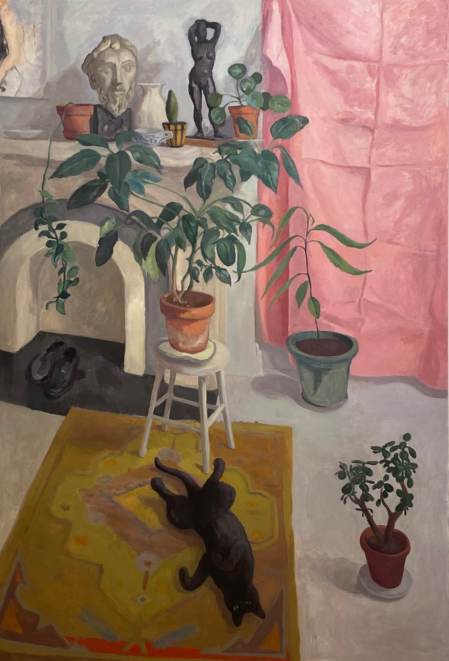 Compositionally, the painting is defined by a vertical axis consisting of a black cat lying on its back, its tail pointed toward the top of the canvas, atop an earth-toned rug anchored by a white stool, on which the umbrella plant sits. The branches and leaves reach up to the mantelpiece, where we see a classical bust and a small black sculpture of a female nude, echoing the cat.