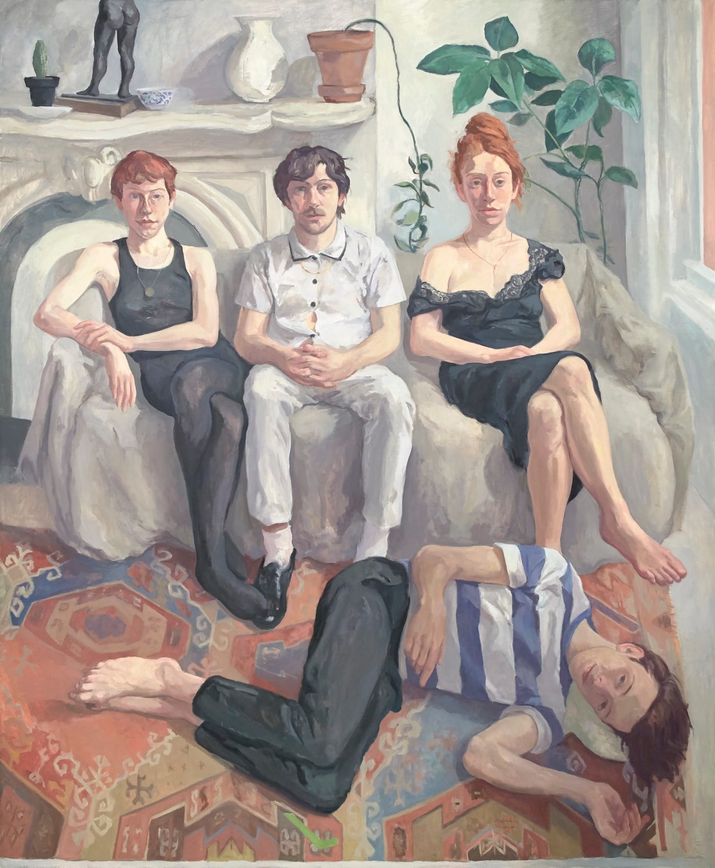 A grouping of three young adults on a couch and a figure lying on the floor before them, looking up, “Young Group” is Bailey’s response to Lucian Freud’s well-known painting “Large Interior W11 (after Watteau)” (1981-83), which was his response to the Rococo artist.