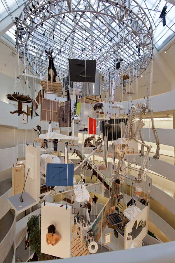 Maurizio Cattelan’s All explodes on impact: all noise, heat and light, followed by gradually dissipating trails of smoke. The Italian anti-artist’s anti-retrospective at the Guggenheim, as everyone has heard, hangs in toto from the oculus of the Wright ramp.