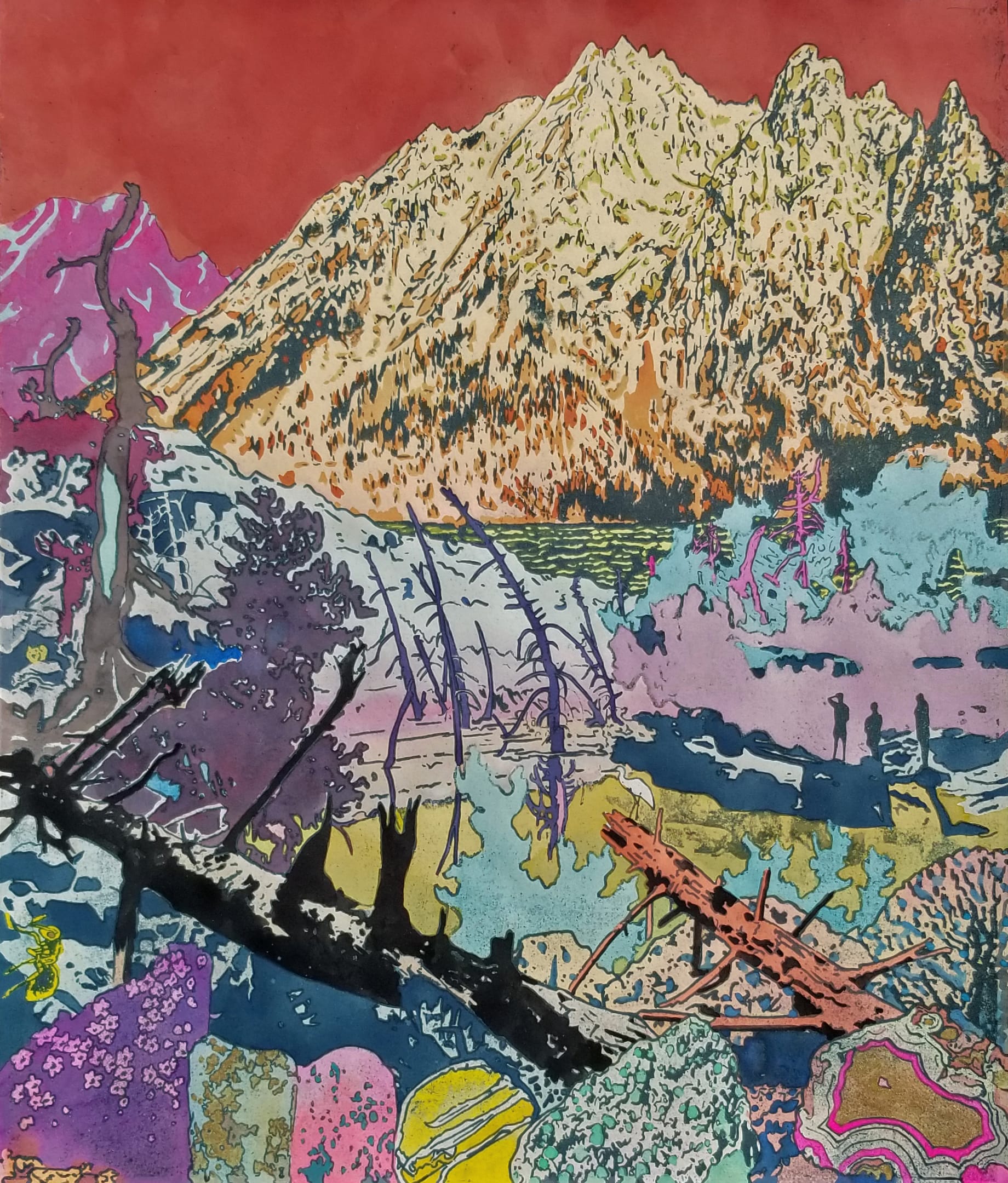 Concurrent at Benrubi’s Project Space, Aaron Morse’s Elements of Geology comes with less eco-conceptual packaging than ALL THE WORLD and The Critical Zone but its vivid paintings suggest complex ideas. Incorporating both watercolors and acrylics, the paintings depict land- and seascapes as dense amalgams of hallucinatory color. The works’ constituent forms — mountains, trees, waves — are rendered in historical styles, such as Japanese woodcuts and nature-guide illustrations, crammed alongside and atop one another in slightly implausible configurations. Each form or group of forms is comprised of an even more implausible color: a sickly, pale pink mountain range; a minty cluster of turquoise and teal trees; seafoam streaked with shades of saffron and peach.
