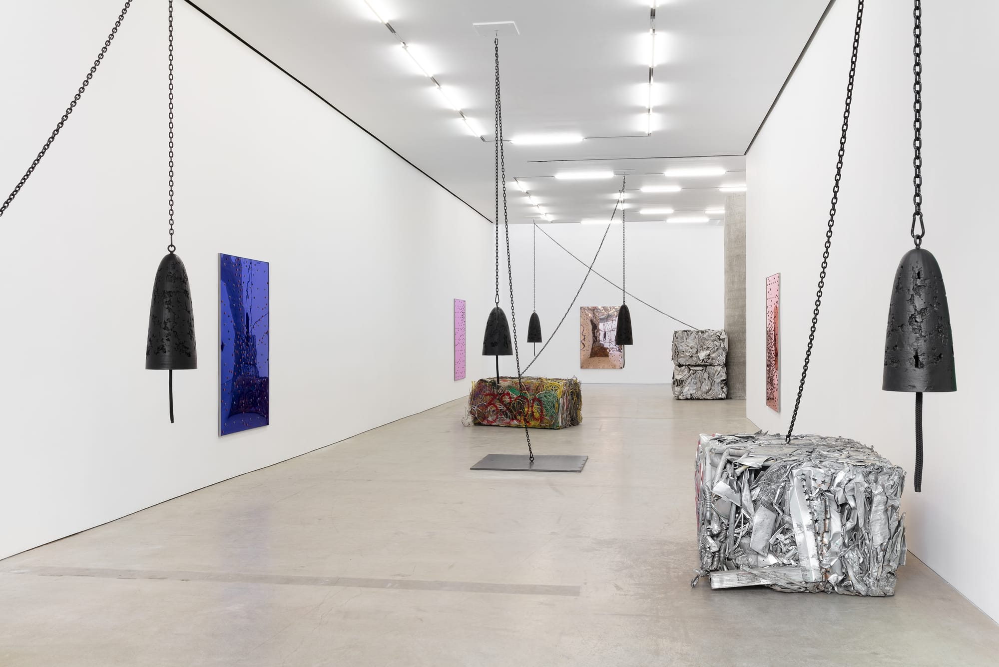 At Marlborough Contemporary, Davina Semo’s ALL THE WORLD addresses our era’s ecological anxiety with disjointed ambition. Half a dozen large rectangular bales of industrial waste — each at least 30 x 65 x 42 inches in size and comprised of either aluminum scraps or frayed wires — are dispersed on the gallery floor. Affixed to each bale is a black, powder-coated metal chain that connects to the ceiling; dangling from it, at eye level, is a craggy, matte-black cast bronze bell that viewers can ring. On the surrounding walls hang monochrome acrylic mirrors, whose wavy neon surfaces are dotted with the ball bearings used for skateboard wheels and fidget spinners. The mirrors amplify and distort the looming, enigmatic presences of the interconnected bales, chains, and bells.