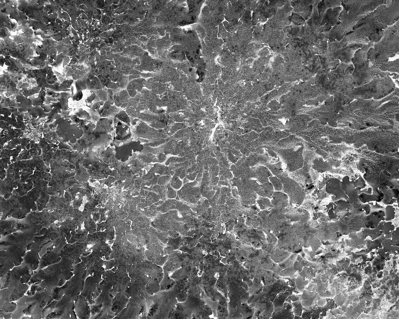 Katherine Wolkoff’s The Critical Zone, at Benrubi Gallery, also suffers from a vague conceit, though the individual works are refined. “Critical Zone” is a scientific term referring to the layers of soil, water, rock, vegetation, and living organisms that co-exist, and sustain human life, in the areas just above and below the earth’s surface. Wolkoff’s large-scale gelatin silver prints render this heterogeneous zone in intricate, stylized black-and-white abstractions whose referents — swirls and splotches of lichen; striated and craggy rock formations; roiling bodies of water; reticulated bark beetle marks — are only sometimes discernible without the works’ titles. Shot from a variety of perspectives, such as bird’s eye views and microscopic close ups, then altered in post-production, the images belong to a strain of contemporary photography — including the work of Edward Burtynsky and Justin Brice-Guariglia — that documents the environment with an imaginative twist.