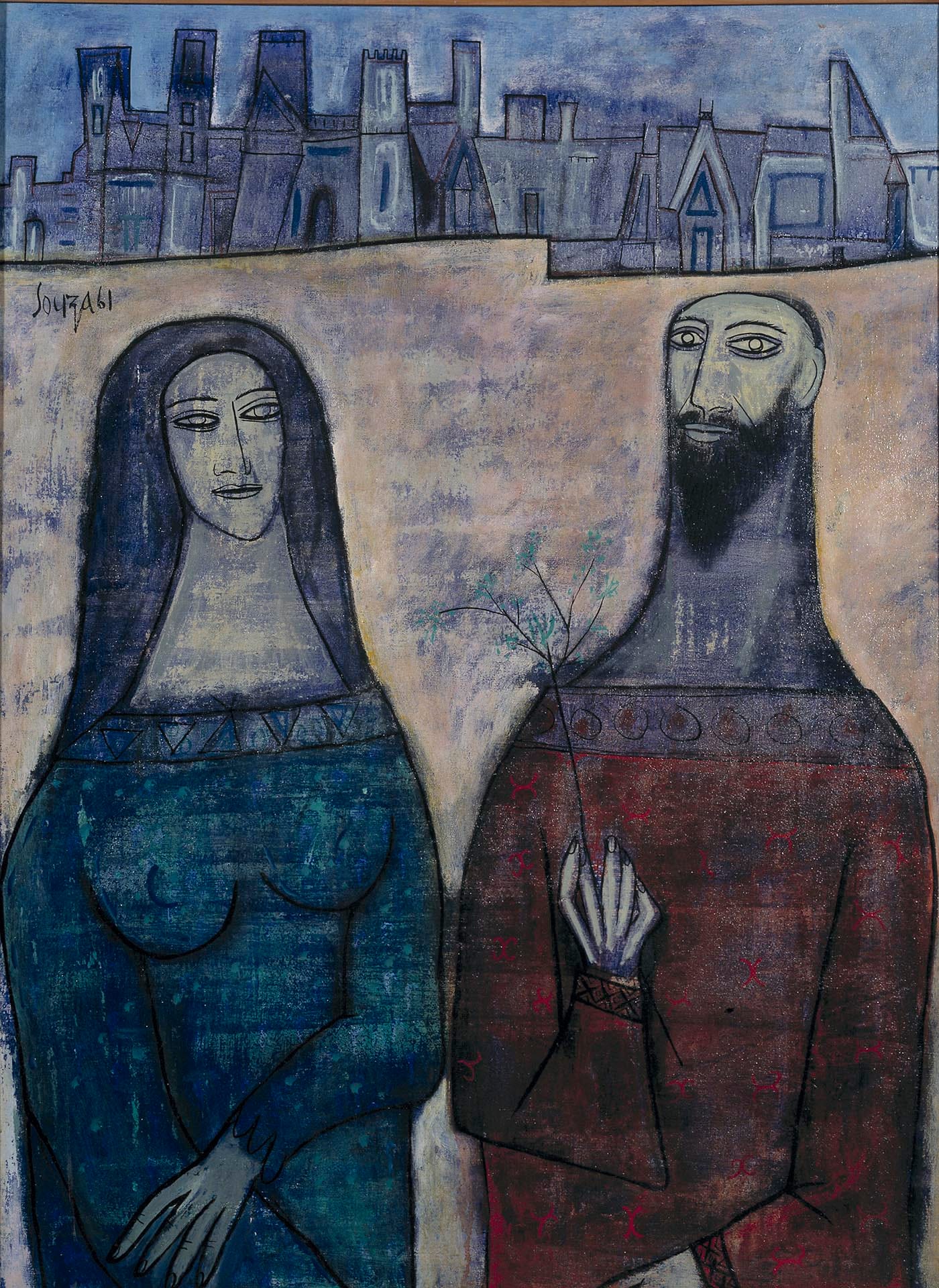 The same principle is put to work with similar effect on artists characterized by their preference for impasto technique, where paint is laid so thickly as to become semi-sculptural, almost high-relief. Frank Auerbach’s 1960 “Head of E.O.W.I” is an extremely plastic riot of yellow, red, and white in which a smeared portrait illusion becomes apparent from a certain distance, and Leon Kossoff’s “Children’s Swimming Pool, Autumn Afternoon” of 1971 is a barely distinguishable vision that communicates through shimmering blue and beige hues the joyously bright and fun scene of the title. A whole room given to FN Souza demonstrates similarly the power of painterly technique over narrative content; supremely bold is his 1965 “Two Saints (After El Greco)” in which the entire surface is black, with figures distinguishable only by areas of matte versus gloss finish.
