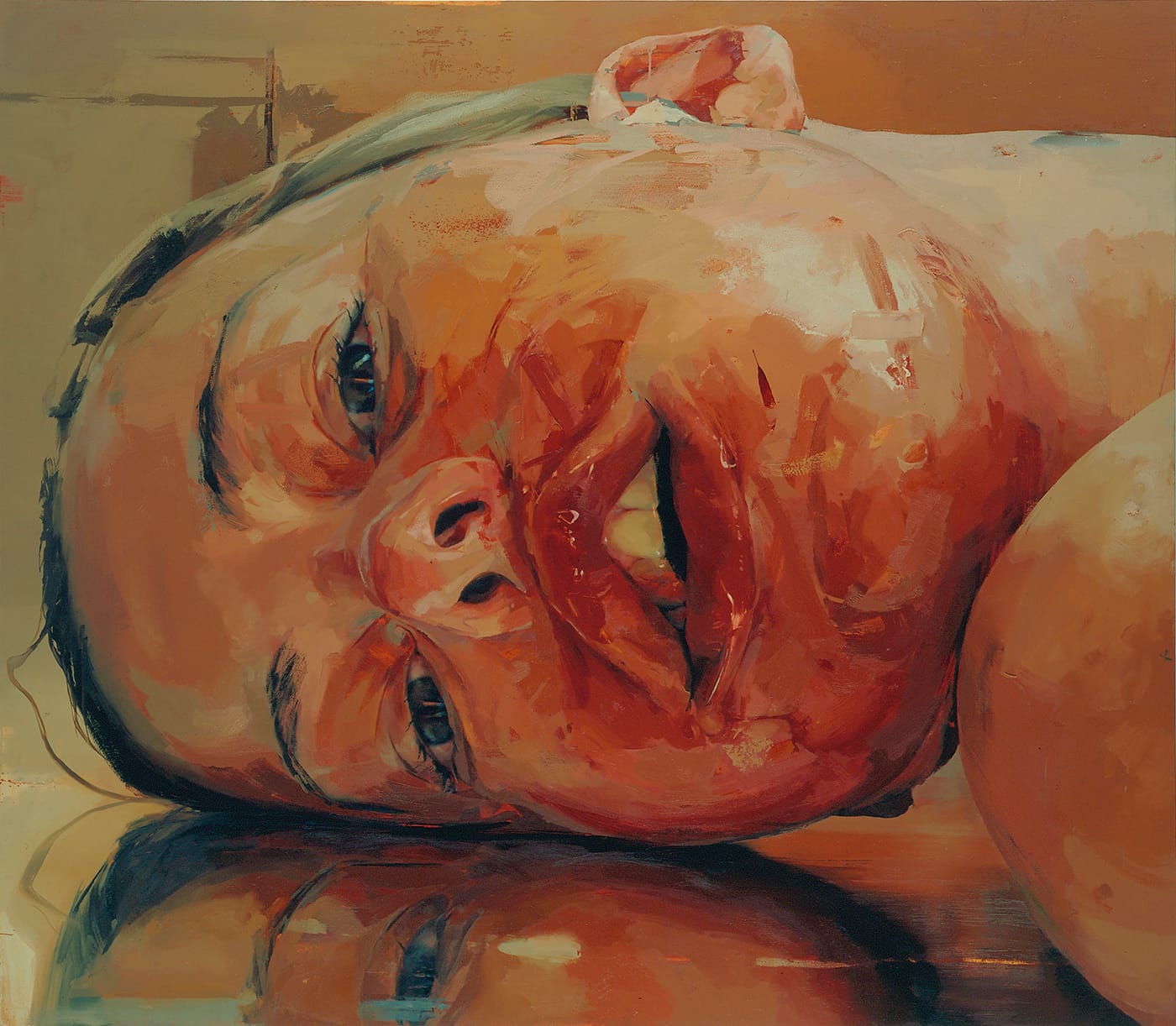 The size and expanse of the galleries to fill, combined with the relatively non-prescriptive brief allows for an inclusive approach, which is loosely chronologically arranged. We begin with Stanley Spencer, Walter Richard Sickert, and Chaïm Soutine, all working in the first half of the century and related, by the curators, through their practice of working from life. The styles vary wildly in mood and tone from the hot orange flesh of Spencer in domestic nude studies, to sombre Sickert interiors in grim Camden, and the brilliant seedy red of Soutine’s bell boys from the underbelly of Parisian hotels, each thematically distinguished by the artists’ personal situation. Still, we are invited to consider the paintings as a shared exercise in capturing the material-ness of experience. The importance given to brushwork and technique is highlighted as much as color. From the start, the curators seem to have no problem including Paris-based Soutine in a show supposedly focusing on London.