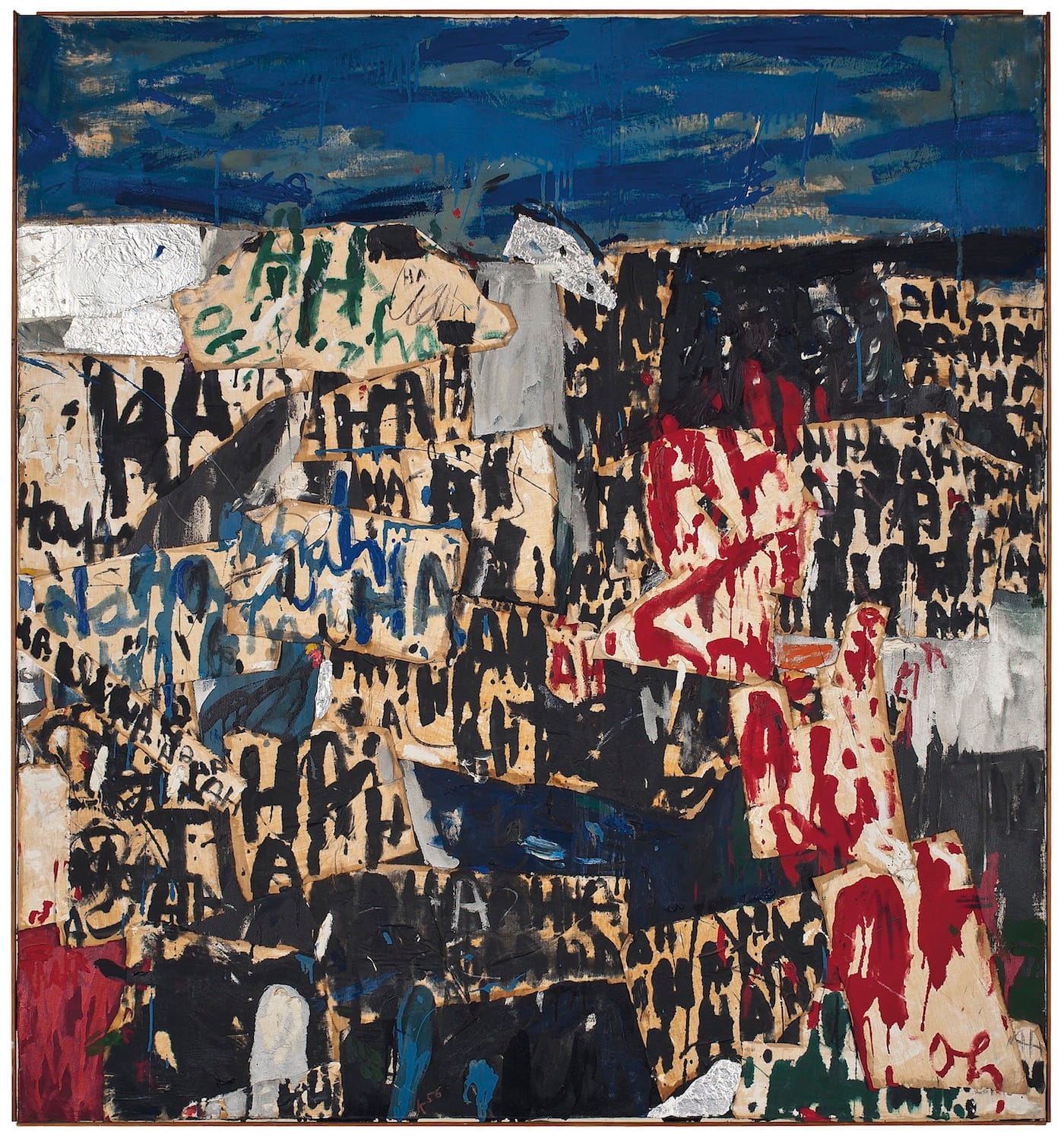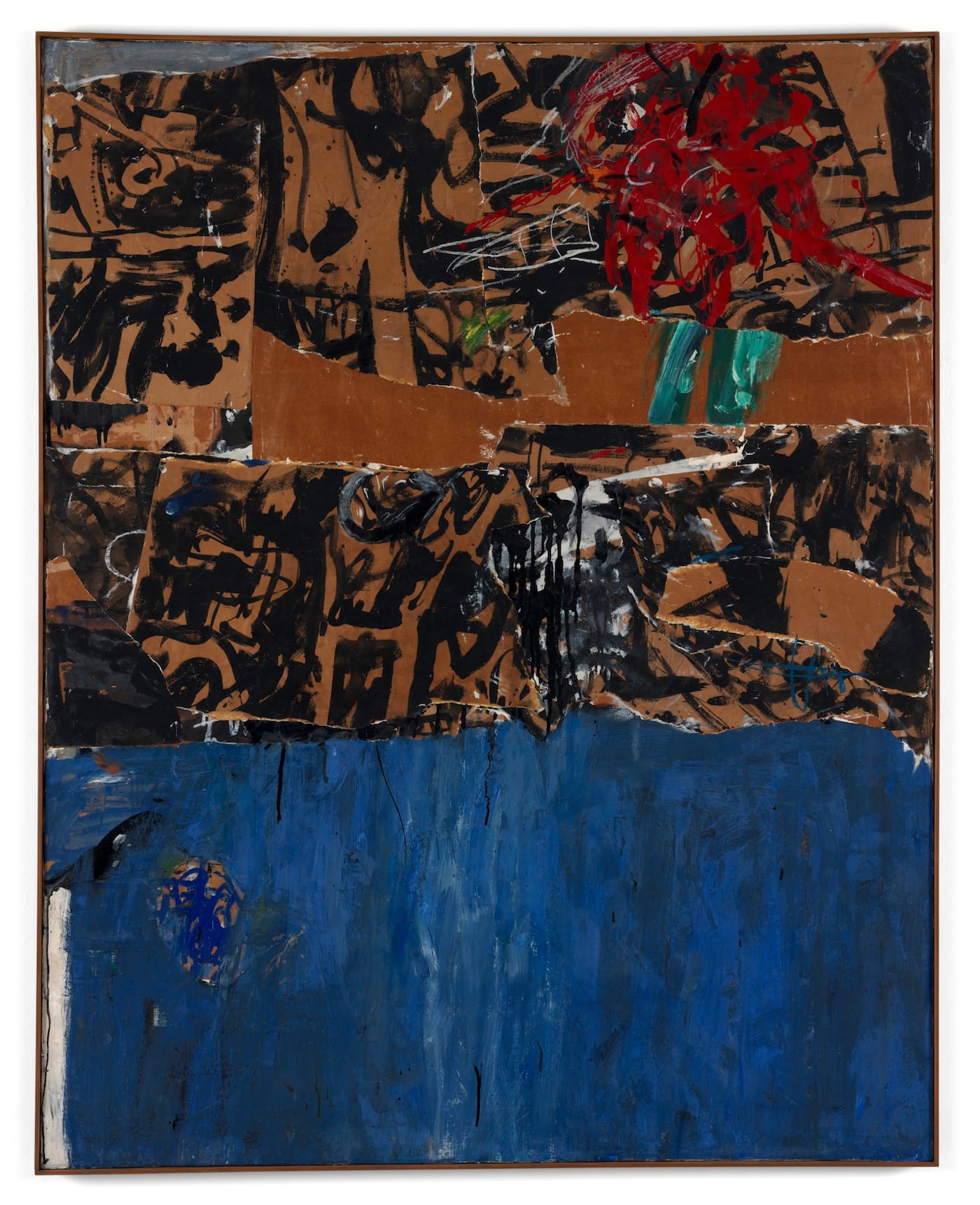 The materials he used for the collages, represented here by “Blue Blue Blue,” “Caged Pheasant #1,” “Caged Pheasant #2,” and “Hysteria” (all 1956), included cardboard, silver foil, newspaper, and fabric. With these works he seems to leapfrog from pre-abstraction to post-abstraction, à la Robert Rauschenberg’s trash-and-cardboard assemblages.