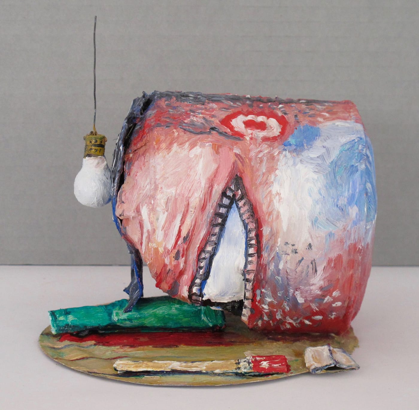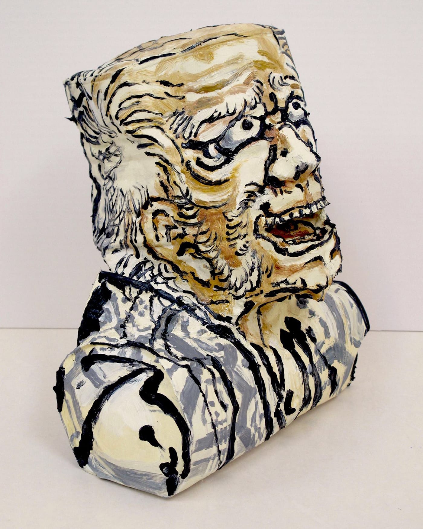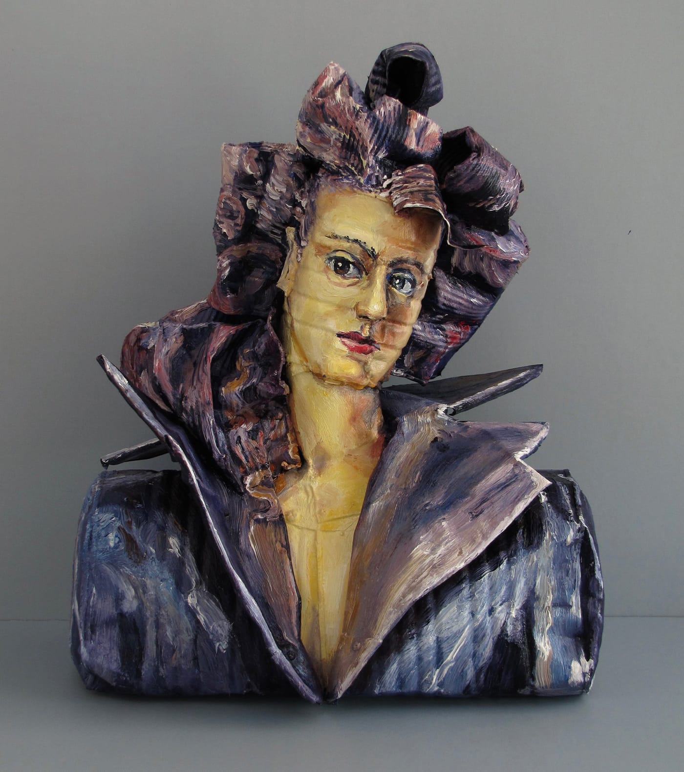 “Tomato sauce cans are already shaped like heads,” he said. “Cookie tins sometimes make good torsos. Bean cans are just right for arms and necks. Sardine cans make great hands. Lids have rings embossed on them that work perfectly for ears, and also become noses that I have learned to bend, slot, and tab onto the faces. But the underlying imaginative thrill comes from the transposing of a flat-painted subject into three dimensions and the IRONy of the realistic copying of the fluid original onto a rather clunky and unyielding surface.”