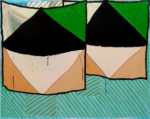 In “Monday” (2011), it’s as if two identical, overlapping, flimsy rectangles of fabric, both outlined in black, have been hung near the top of the painting. The left top side of the rectangle is a thin wash through which we see Miller’s previous marks. In each rectangle is a diamond, the top half of which is a dense black, while the bottom half is a pale tan. Although the painting is straightforward, it doesn’t become literal. It stirred up thoughts about covering and uncovering (as an artistic goal), detail, repetition and decoration, and Michel de Certeau’s book, The Practice of Everyday Life.