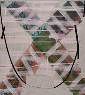 From the outset, the differences and divergences between Miller and those she talks to are apparent. She is not interested in the exotic—her patterns tend to be grids and her repetitions are usually a cluster of short parallel lines. If the sources are actual pieces of printed cloth, they are the kinds that are mass-produced and available in discount stores. She doesn’t use collage or any traditional “women’s” techniques such as sewing. It is all paint.
