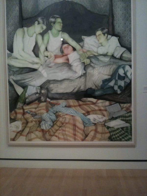 Take for example, “Bed Ridden” (2007). It’s a time-lapse painting of a sick young man. Groundless, bound by weakness, his entire existence is the bed itself. Ninety hatch mark the passage of time, discarded entertainments and the remains of nourishments surround him. Nothing exists outside. No family, friends, doctors. It is a personal apocalypse, universally experienced.