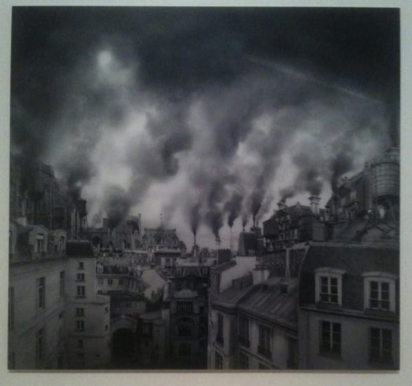 On a larger scope, Smoke Stacks reminds me that we are all contributors to the decline of our environment. Heavily and expertly edited, the cityscape is made up of images of the same set of buildings and smokestacks, taken from slightly different angles and recombined. The escape from the real space of photography opens up a metaphorical geography in which there is no visible ground or grid-like order to the streets.