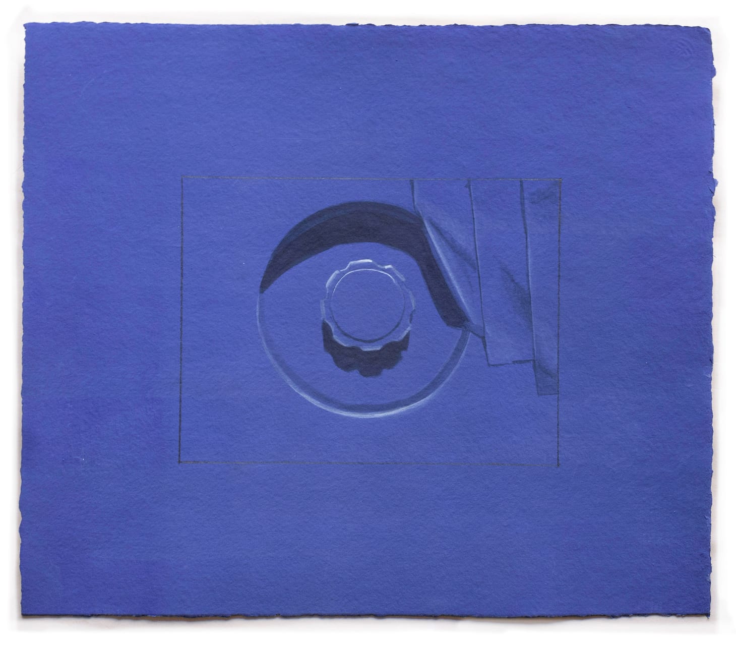 In her works on toned paper, Sultan defines a rectangle within the rectangle. Within the smaller rectangle, which functions as an illusionistic inset, she depicts a highly cropped view of a wheel-like form or a cylinder.