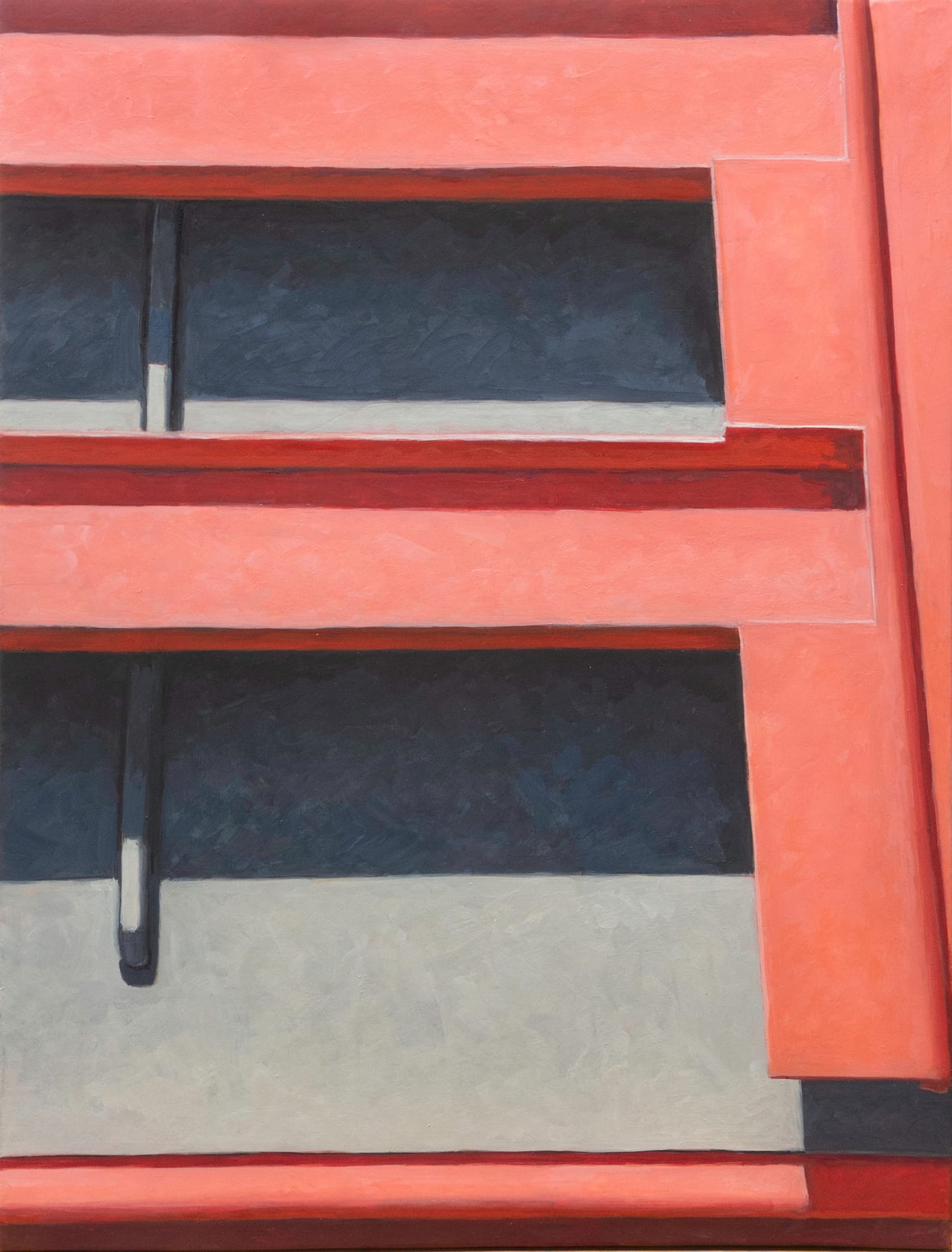 The egg tempera paintings are based on photographs Sultan takes of agricultural machinery. She edits the images until she arrives at a geometric composition based on the machines. The luminous palette of pinks, blues, and yellows, accented by different intensities of gray, combined with the close-up views, makes the source nearly impossible to guess. Sultan wants to transport the viewer to a place where the thing itself falls away, and the elemental pleasure of gazing intently at the interplay of surface, form, space, color, shadow, and light takes over.