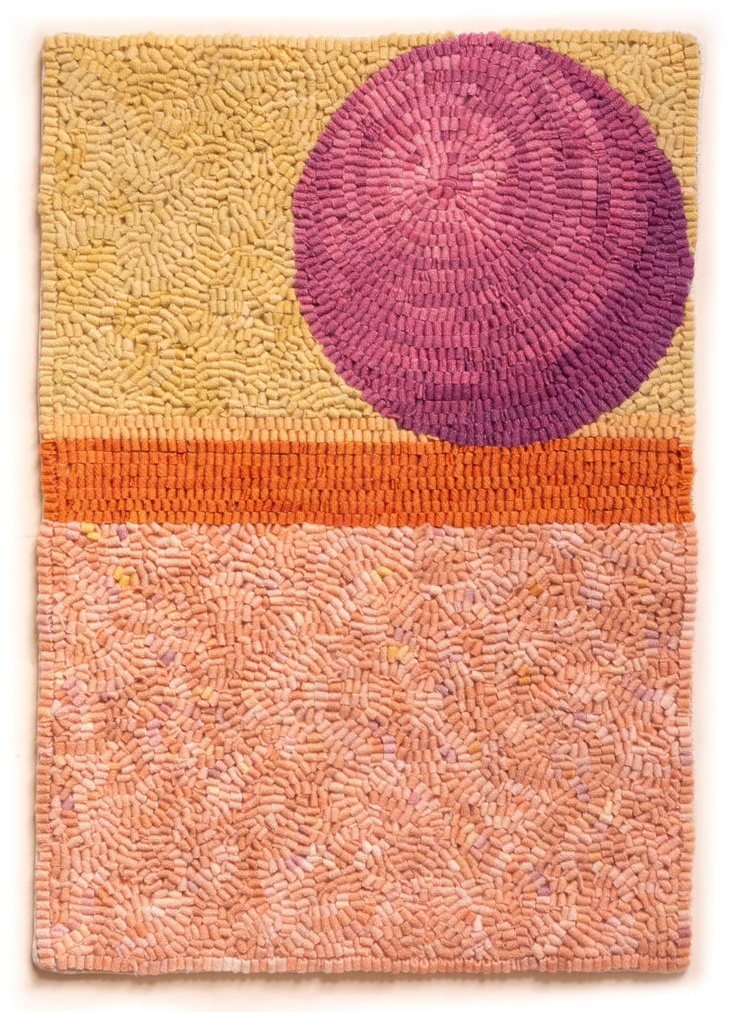 In “Sphere” (hand-dyed wool on linen, 16 x 11 inches, 2020), Sultan arranges the hand-dyed woolen tubes into distinctly colored sections, turning the work into a pictorial composition, rather than a patterned one. By hooking each section in a particular direction, she defines the sphere according to a circular alignment, which goes from dark mauve along the bottom edge to light mauve at the top and center. This suggests an aerial view of a sphere lying on a pale umber ground, while, at the same time, the orange band beneath it evokes the possibility that it is resting on a shelf.