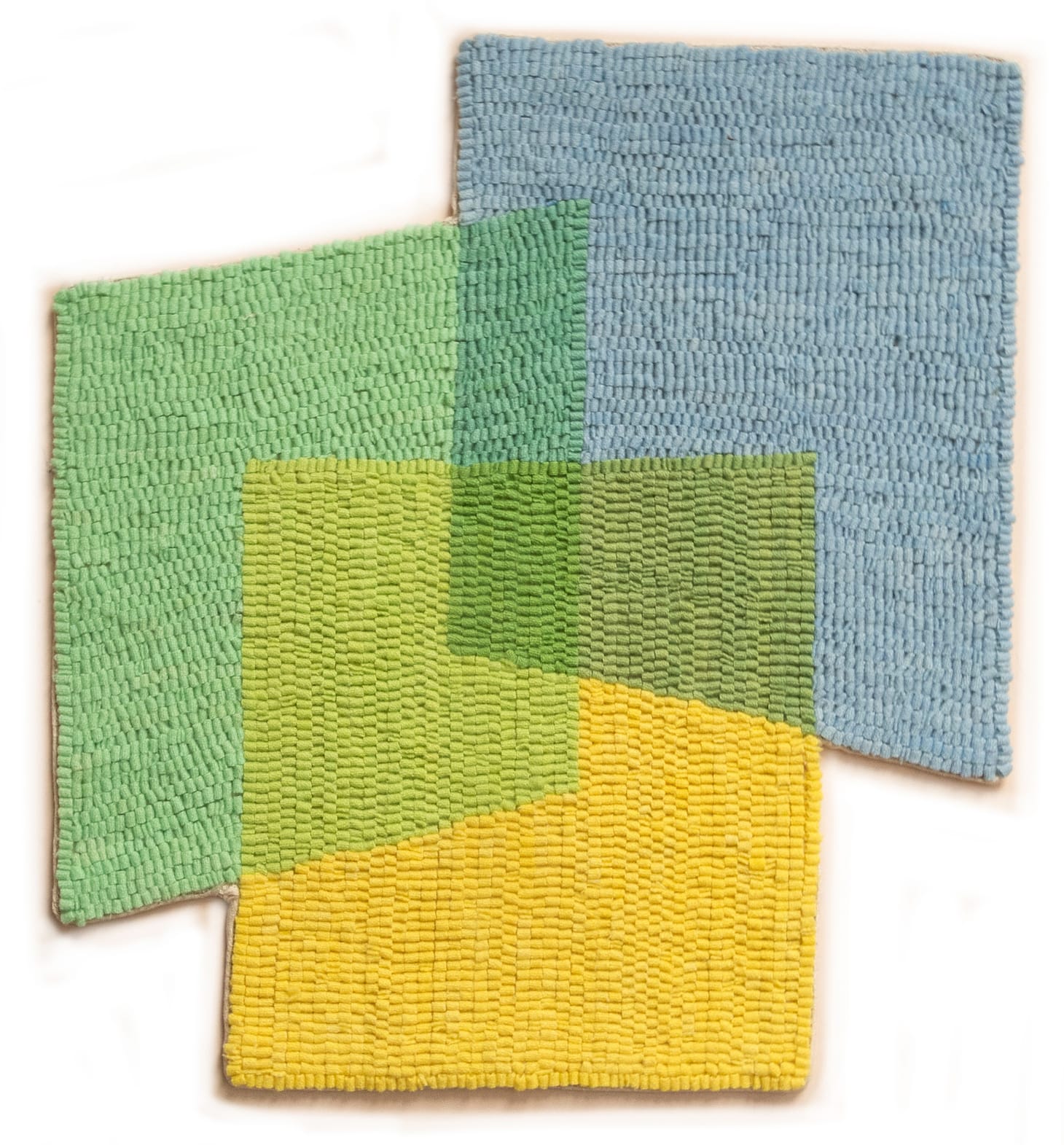 “Transparent” (hand-dyed wool on linen, 16 1/4 x 14 3/4 inches, 2020) is a magnificent visual conundrum composed of two parallelograms overlapping a rectangle. Imagine Frank Stella’s shaped paintings meeting Josef Albers’s color studies in a hooked rug, where each tubular, macaroni-like stitch of color is visible, like an elongated bead of paint, and you’ll get some idea of the perceptual paradoxes that Sultan achieves in these works.