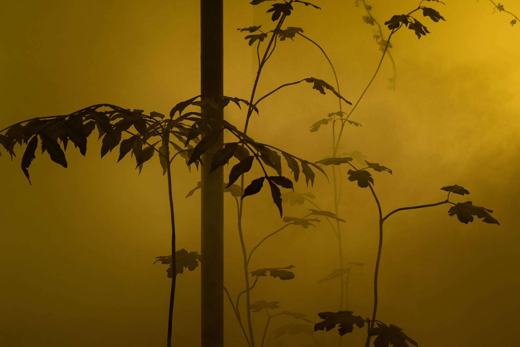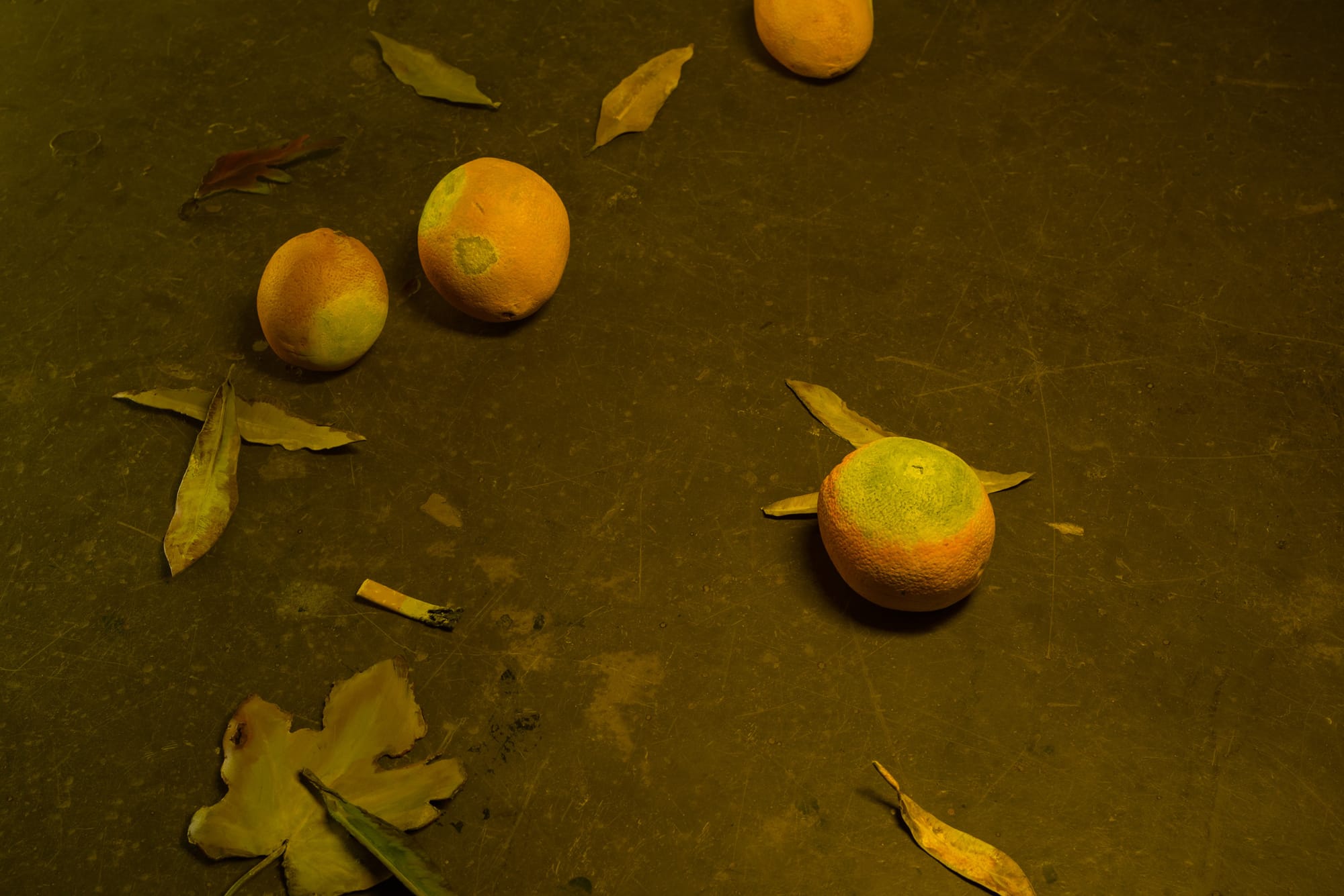 In the single room space of The Awakening, clusters of metallic, hexagonal parasols serve as backdrop for a lively theatre of decay. Evoking Spain’s iconic pavilion at the Brussels World’s Fair in 1958 — later reconstructed in Madrid’s sprawling Casa del Campo park — the prefabricated elements contrast with otherwise organic motifs. Shrivelling leaves fall from the branches of small trees, while a limp racoon costume appears like a carcass, strewn amongst extinguished cigarette butts and molding oranges. The space is segmented by portions of chicken-wire fence and bathed in an atmosphere of fog and lurid yellow light that fluctuates amid a reverberating soundscape of intense, dissonant noise.