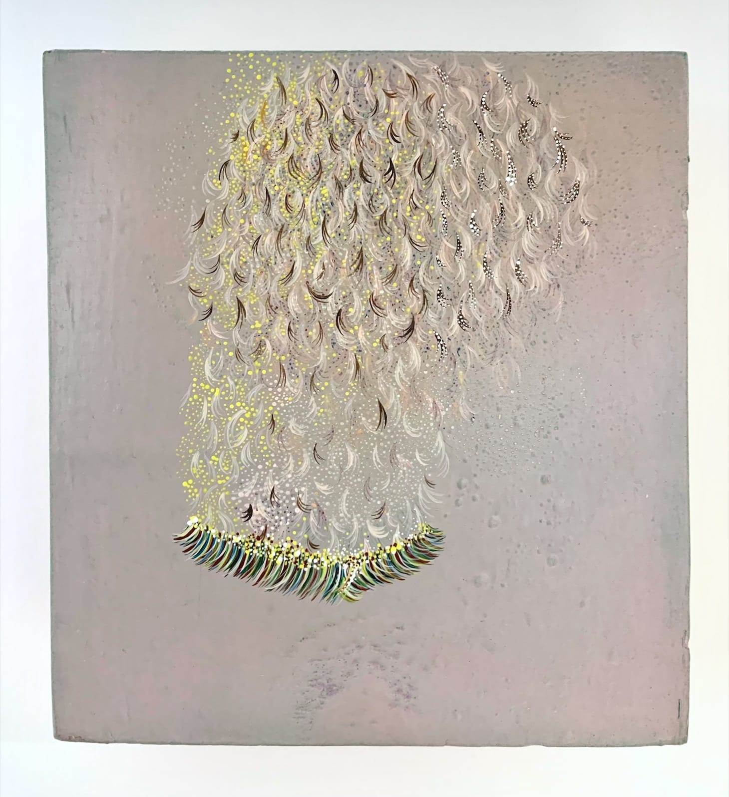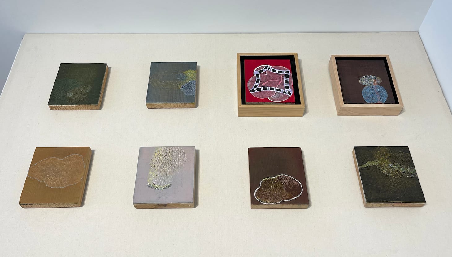 Judging by this show alone, and the span it covers (16 works dated between 2007 and 2021), “A Quieter Battle” and “Trusting the River” represent a breakthrough for Rosner, as they show her ability to work on a large surface. While continuities are apparent between these large paintings and the other works done since 2013, the eight small works arranged in a vitrine in the back gallery, all in acrylic and ink on raw pine, really made my head spin. The largest measured 5 1/2 by 6 inches, while the others were 5 7/8 by 5 1/4 inches. Titles such as “Moment (with tiny white dots)” (2006) and “Moment (dark)” (2007) point to Rosner’s longstanding focus on time.