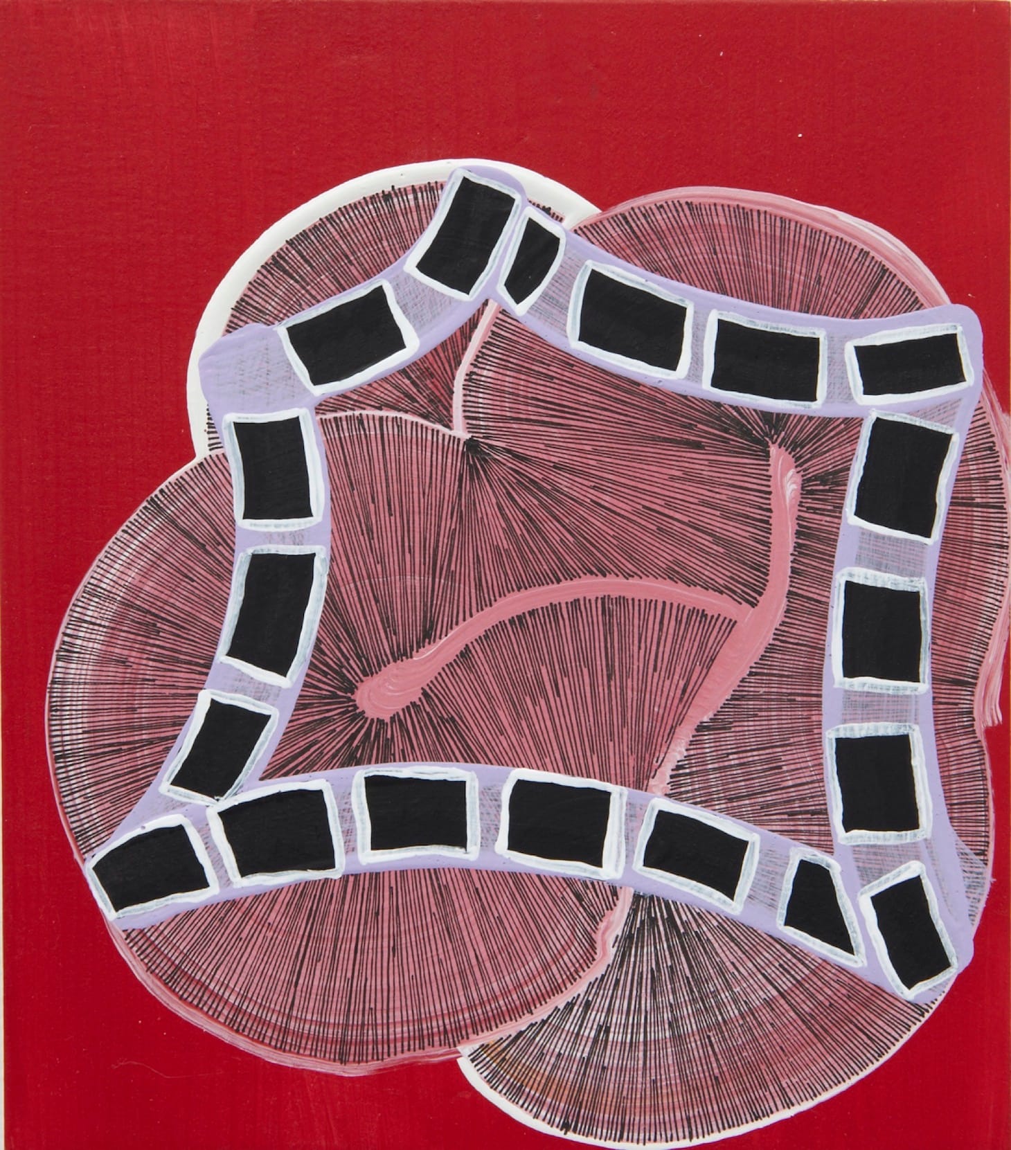 Overlaying an unevenly stained purple ground, Rosner’s linear lexicon suggests, to this viewer at least, a river’s currents, a strong wind, or a spreading fire — a state of constant turbulence.