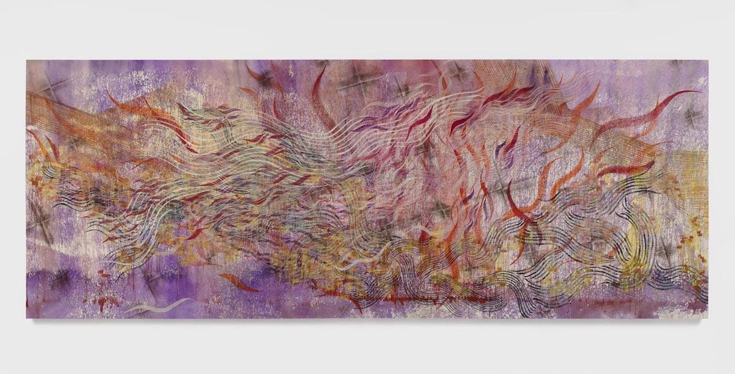 “A Quieter Battle” measures 78 by 202 inches, or 6 1/2 by nearly 17 feet. Dated 2021, the work was done on raw canvas during the pandemic. Its layers and clusters of parallel lines, in yellow, white, violet, and dark crimson, both straight and swirling — like streamers and ribbons — rising, descending, and traversing the canvas, against a stained ground of salmon and pale purple, convey a maelstrom. Its panoramic scale becomes a world, at once abstract and yet suggestive of something real in our life.