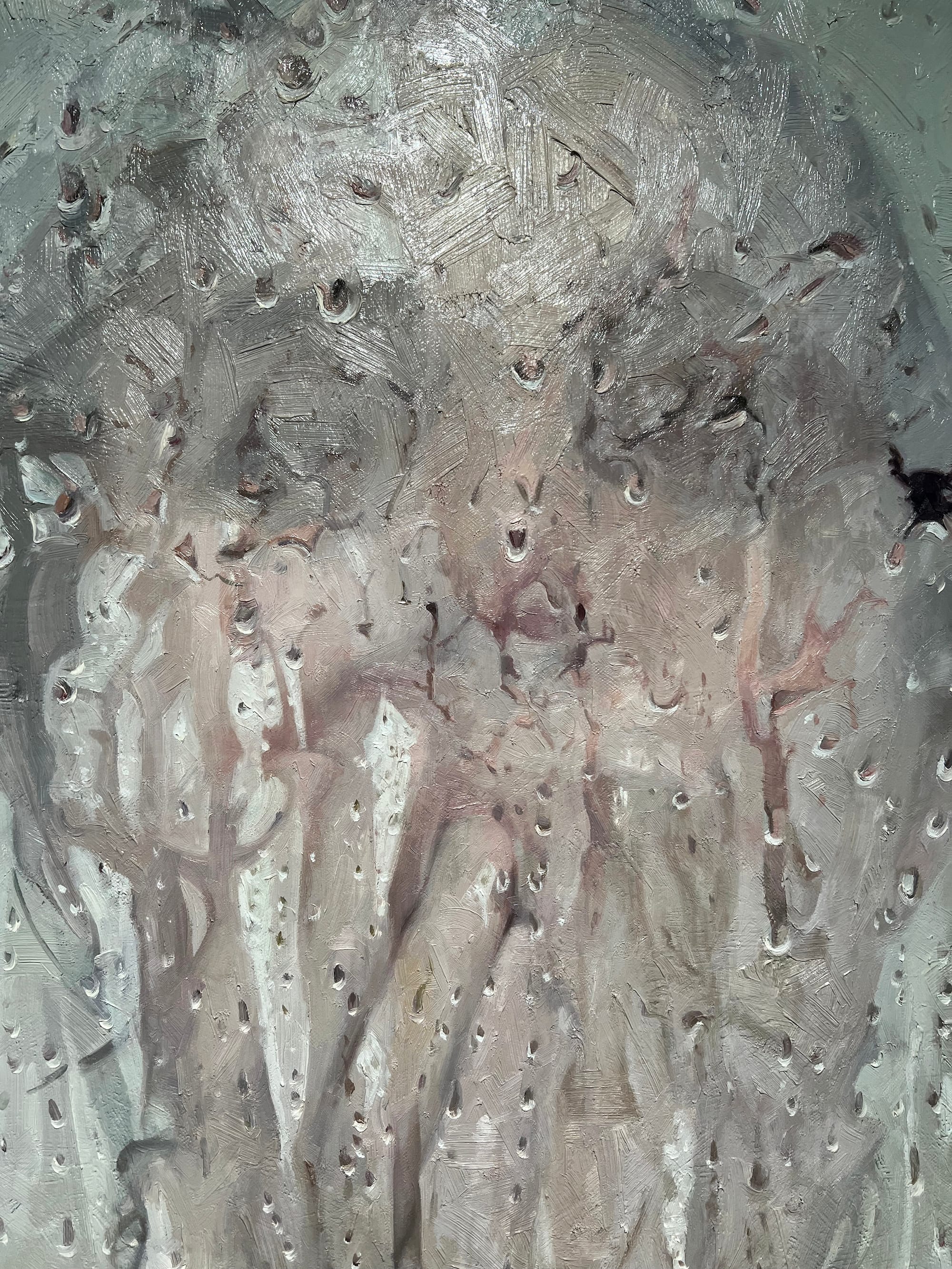 Alyssa’s paintings are about confronting the disquieting space of vulnerability. There’s a solitude of struggle within the subjects, betraying lost innocence or an evolution that can only come from being on the other side of anguish. Sometimes through eye contact, sometimes through flesh, they seduce. But that seduction comes from behind a veil of water, dew, steam or foliage so at one with the figure that we get the sense that over time, it’s become a second skin, a protective barrier warning, "come close, but not too close." This veil between the viewer and the subject is integral to the allure. Alyssa isn’t interested in a perfected beauty; instead, through her subjects, she’s searching for beauty through brokenness, the crack where the light gets in.