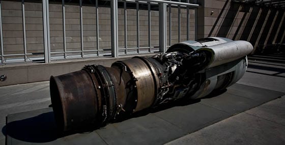Or maybe “sprinkle” with its sundae connotations is too pedestrian for this “provocative gesture” suggesting the “discomfiting conceptual alignment between issues of global security and individual well-being, between anxiety and its alleviation.” A lot of hot air with little in the way of complexity beyond the feat of engineering that any jet engine innately is. A Pratt & Whitney TF33 P9, with its valves and indestructible metallic joints and its elongated aerodynamic tube of a body is a thing of menacing beauty.