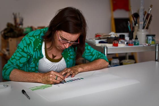 Hughen abstracts the underlying patterns — borrowing from science texts to geological surveys — rendering them all together with lush colors on multivariate levels of murky Mylar. The layers give way to a perplexing sense of optical depth and the varied scale and pattern sources (Bay Area survey lines, nerve-based neurological flowers, Buckminster Fuller spheres) brought together in a single image holds a viewer’s gaze.