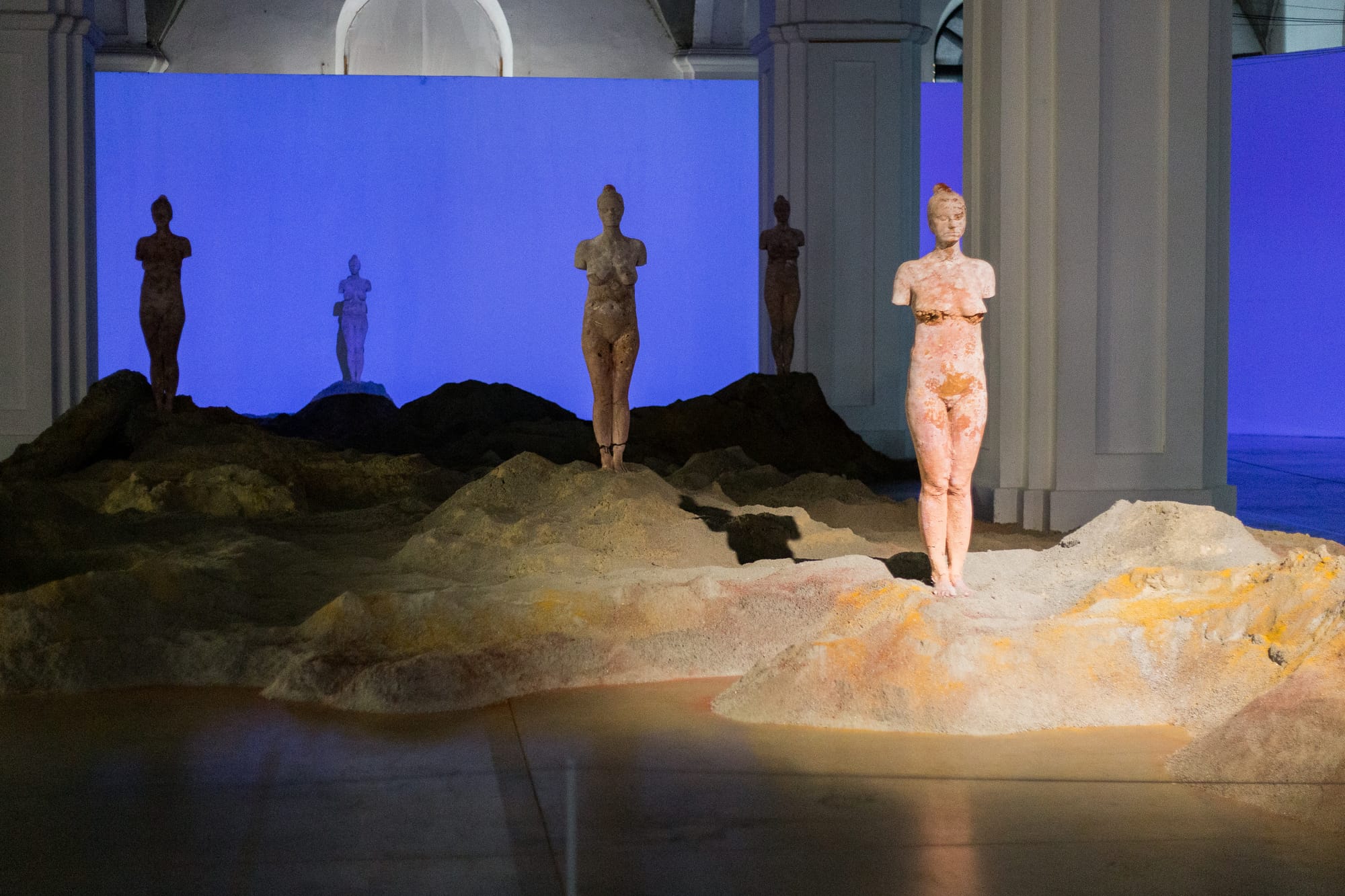 The artist interprets the map of the Kerch peninsula as she recreates its topography and landscape within the contours of the peninsula. She also uses casts of her body that recall Greek sculptures, referencing the Ancient Greek city of Panticapaeum founded around the late 7th or early 6th century BCE in present-day Kerch. The sculptures are made from the same materials as the model of the peninsula, including metal, wood, different types of soil, fossils, cement, stone dust, sand, iron oxides, and sea salt. Her small-scale recreation brings the peninsula back to Ukraine, a copy of the land that was detached, and keeps it from falling in oblivion.
