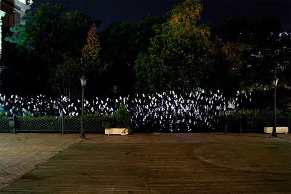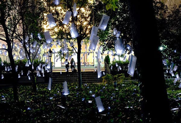 Last October, Luzinterruptus participated in the 2010 Poetas por km2 poetry festival in Madrid with an installation of illuminated poems. They filled the garden with 1,000 white envelopes containing poems written by numerous poets specially for the occasion by the poets who participated in the festi