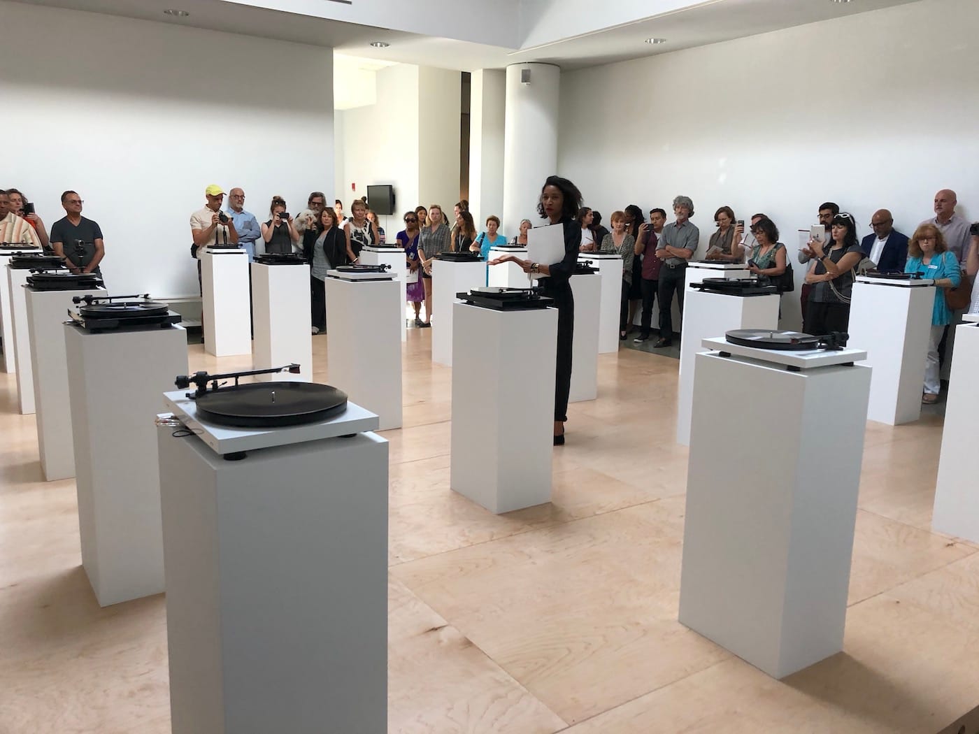 Woods then turned off the record player she was standing at, as four other women stepped up onto the platform and turned off the rest. She exited the gallery, leaving a stunned audience behind.