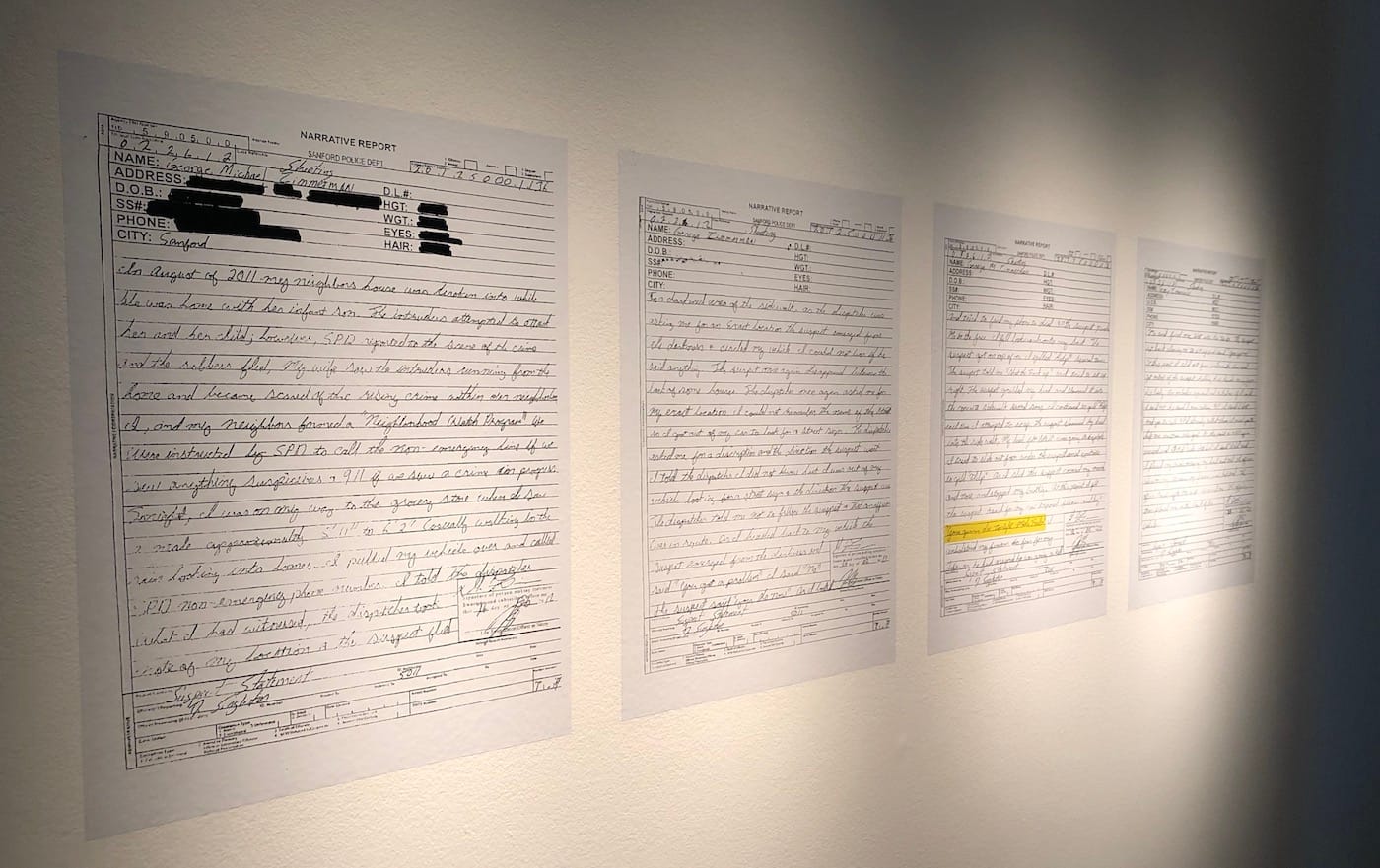 LONG BEACH, Calif. — For the better part of the past year, artist lauren woods has been working on American Monument, a multi-media installation addressing police brutality and the killing of African Americans by police officers. The centerpiece of the monument (woods is adamant that it not be referred to as an exhibition) consists of a grid of 25 record players, each holding a record related to one of these deaths: Sandra Bland, Alton Sterling, Mike Brown, Philando Castile, Eric Garner, and several others. The audio on these records is gathered from police reports, court transcripts, and bystander recordings. Flanking this central piece are 25 boxes of documents related to the cases, as well as blown-up transcripts of testimony by George Zimmerman, who shot and killed Trayvon Martin, and Darren Wilson, the police officer responsible for Brown’s death.