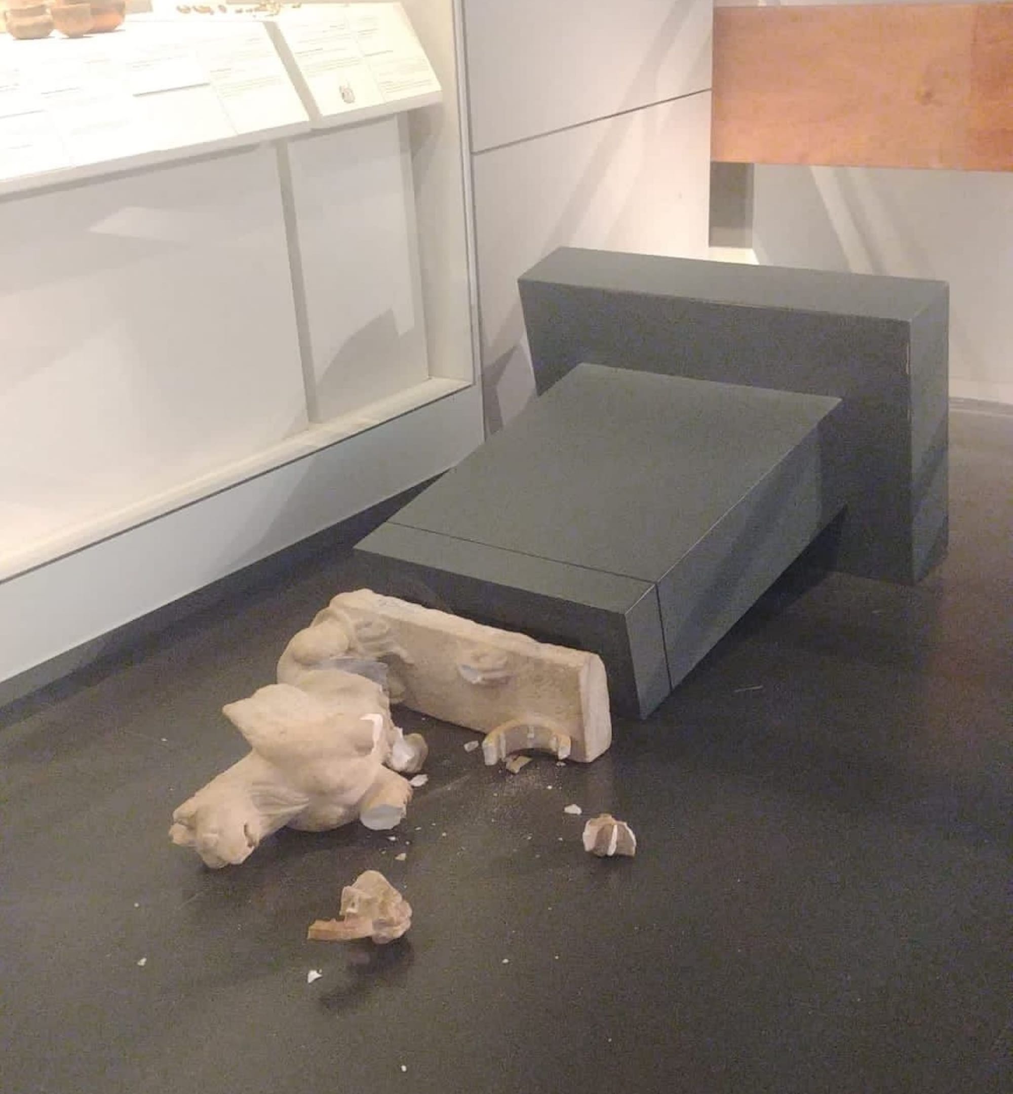 The man toppled over the pedestals on which the two ancient sculptures were sitting, causing significant damage to the works upon impact with the floor in the museum's Archaeology wing. One sculpture was the head of the Ancient Greco-Roman goddess Athena, the only surviving portion of a lost carved stone statue dating back to the 2nd century CE. The neck of the bust appears to have been damaged after disconnecting from the pedestal following the incident.