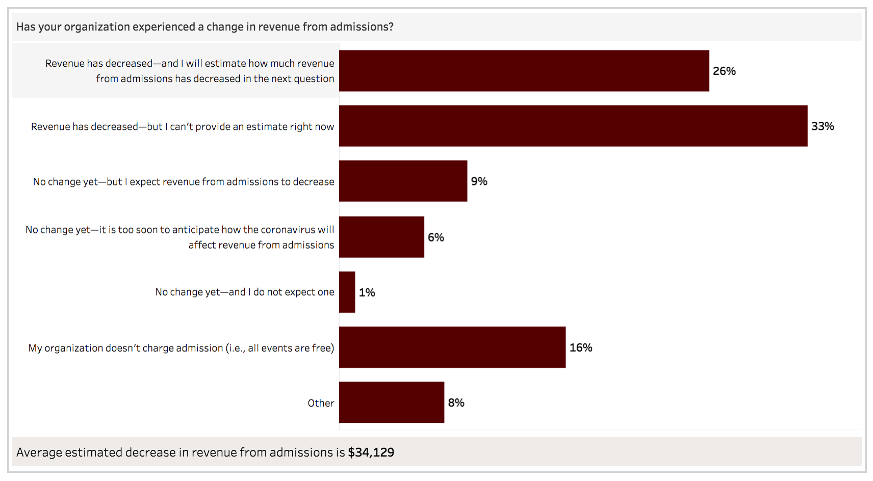 Gathering responses from 11,004 arts organizations as of this writing, AFTA’s survey looks not simply at dollars lost, but at other important indicators of the sector’s health, such as attendance. Economic impact is measured via three categories: loss of admissions revenue (ticket sales, memberships); loss of non-admissions revenue (gift shop sales, contributions); and unexpected expenses (including spending on cleaning and disinfecting protocols, new technologies, and cancelation fees for postponed events.)