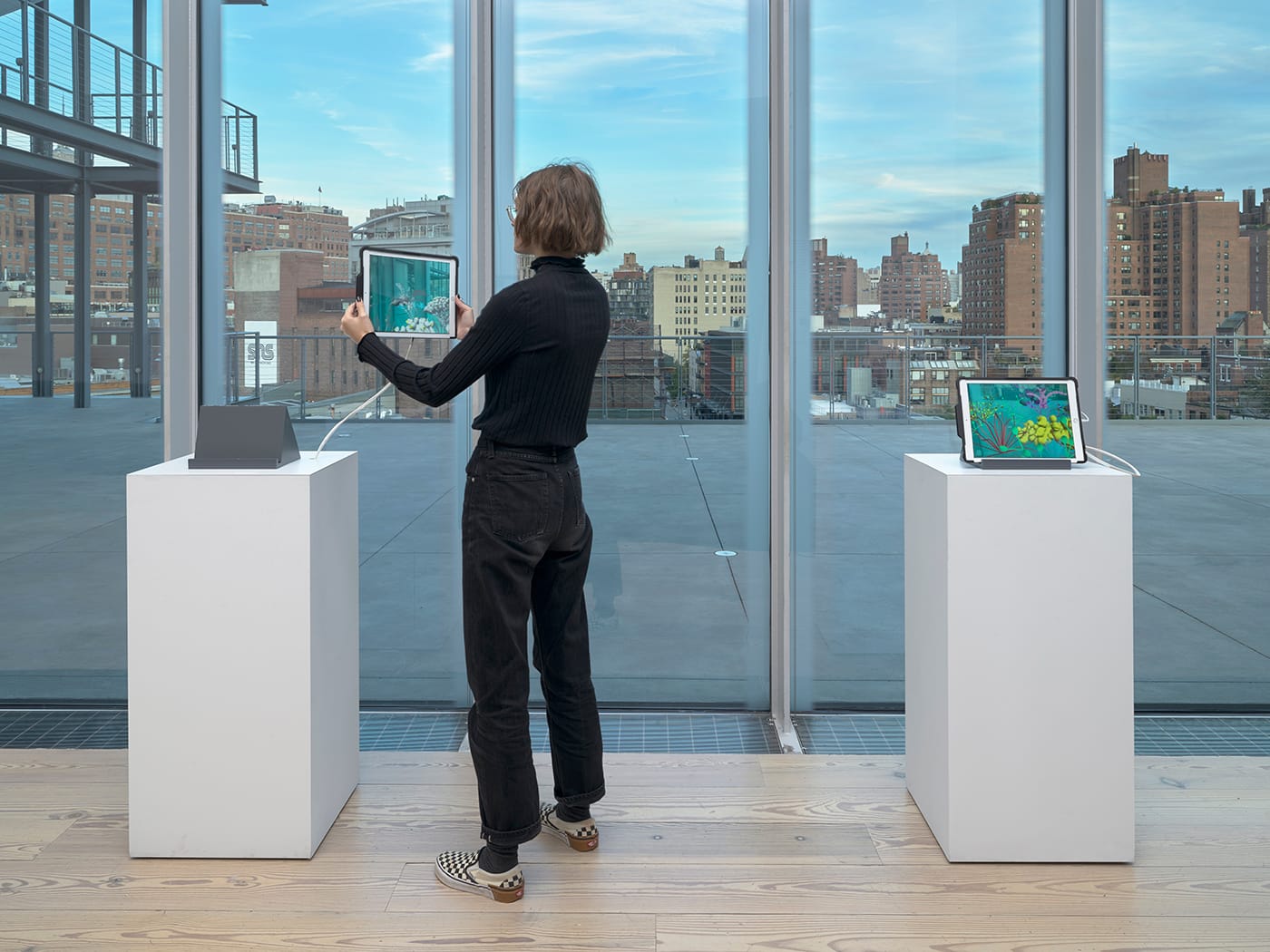 Created by artist Tamiko Thiel in collaboration with /p, the “Unexpected Growth” augmented reality (AR) installation was commissioned by the Whitney as part of Programmed: Rules, Codes, and Choreographies in Art, 1965–2018. “AR, as a form of digital art, was not yet represented in the exhibition and provides an interesting perspective on ‘programming’ since it is invisible until seen through digital devices,” Christiane Paul, adjunct curator of digital art at the Whitney, told Hyperallergic. Paul co-curated Programmed with Associate Director for Conservation and Research Carol Mancusi-Ungaro and Curatorial Assistant Clémence White. “Tamiko is a leading artist in the field of AR and many of her augments have involved natural systems, which are important to the generative qualities of digital art that are highlighted in Programmed.”