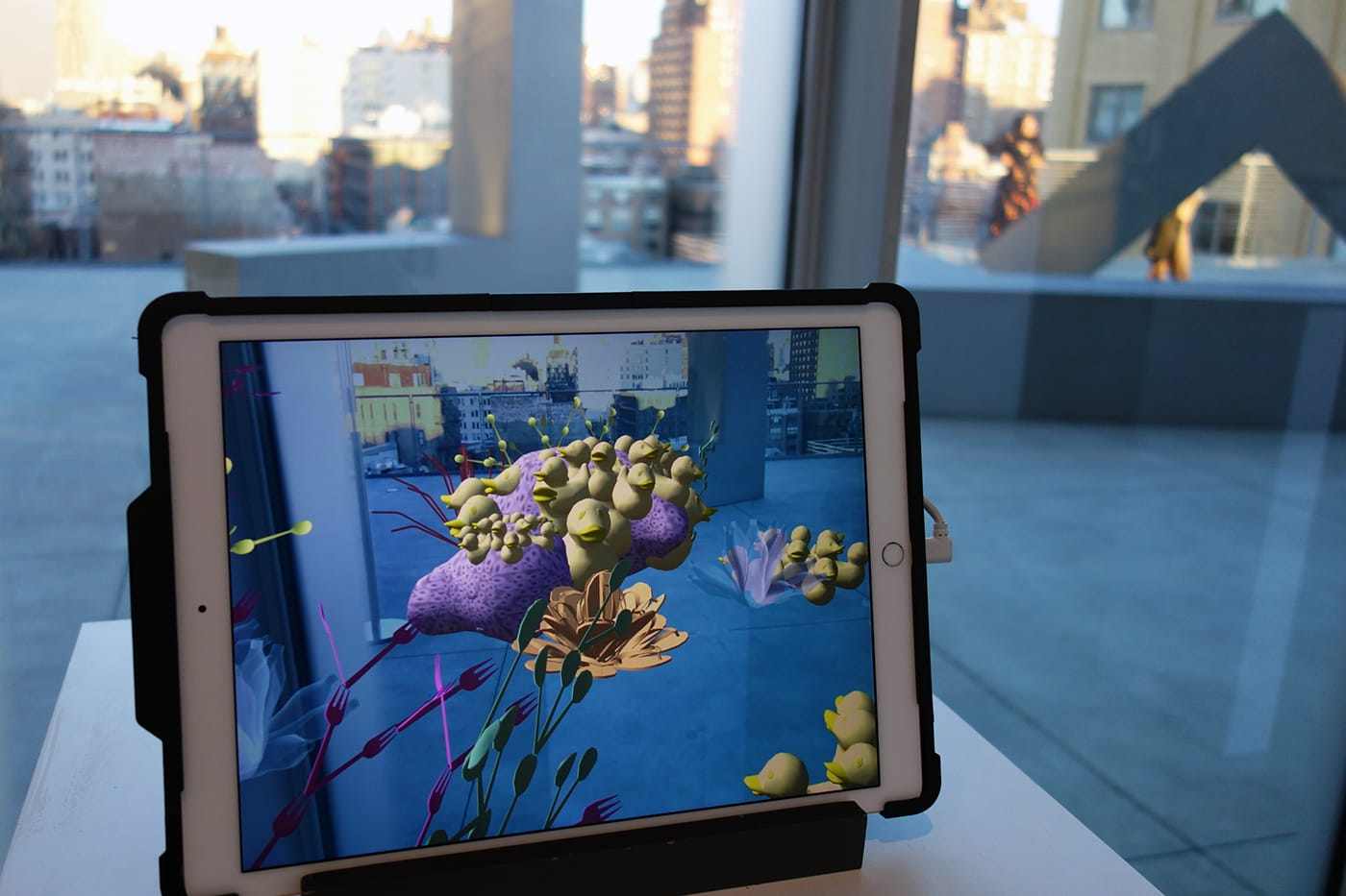Visitors to the Whitney Museum of American Art can now glimpse a dire future when New York is underwater. Up on the sixth floor terrace, an outdoor video screen and two indoor tablets show coral growing on the building. Although they are vibrantly colorful, with a liveliness accented by an ocean noise soundtrack, closer inspection reveals they are composed of plastic trash like flip-flops, straws, and rubber ducks. During the course of the day, they are slowly desaturated until they are a ghostly white.