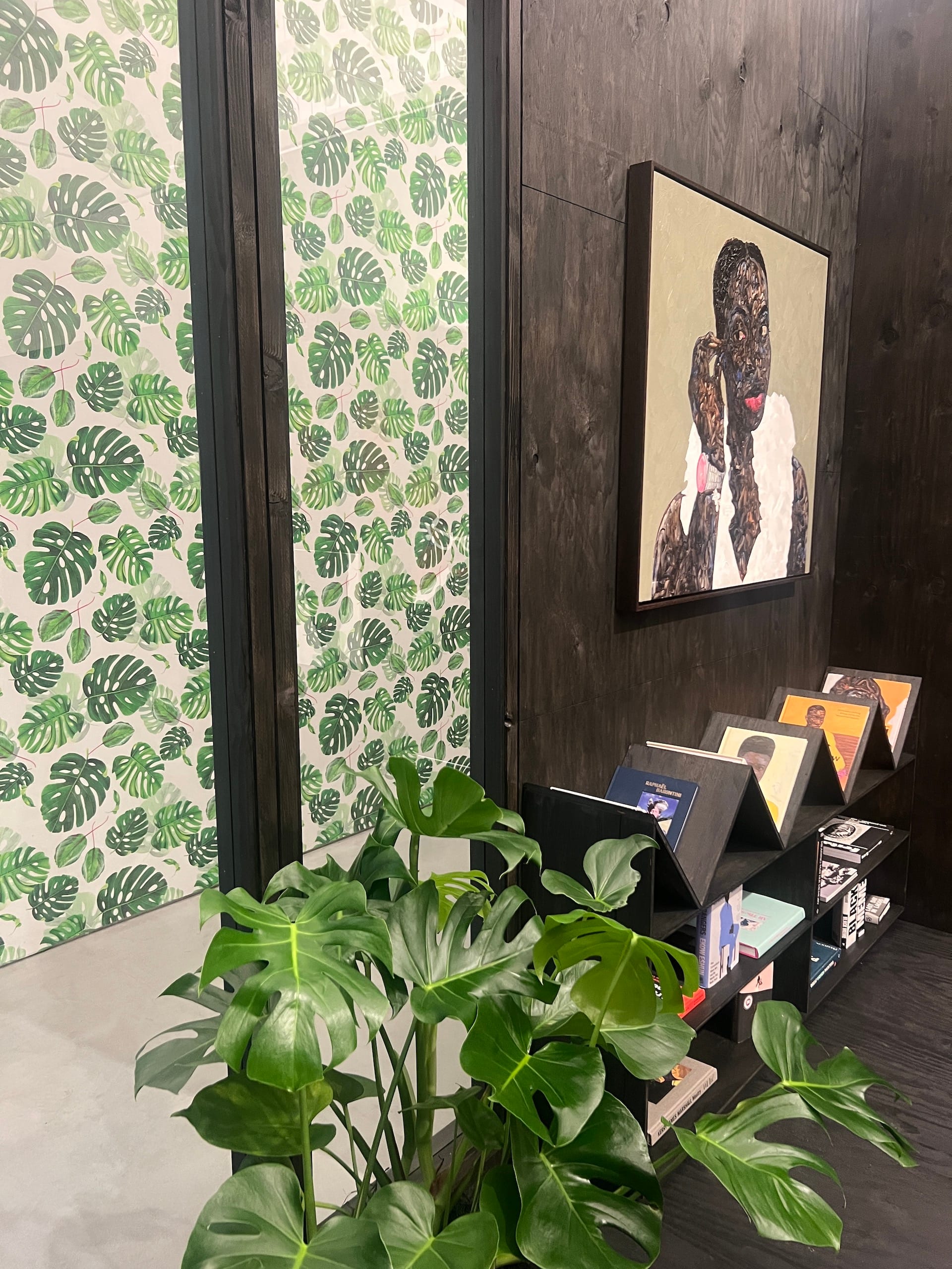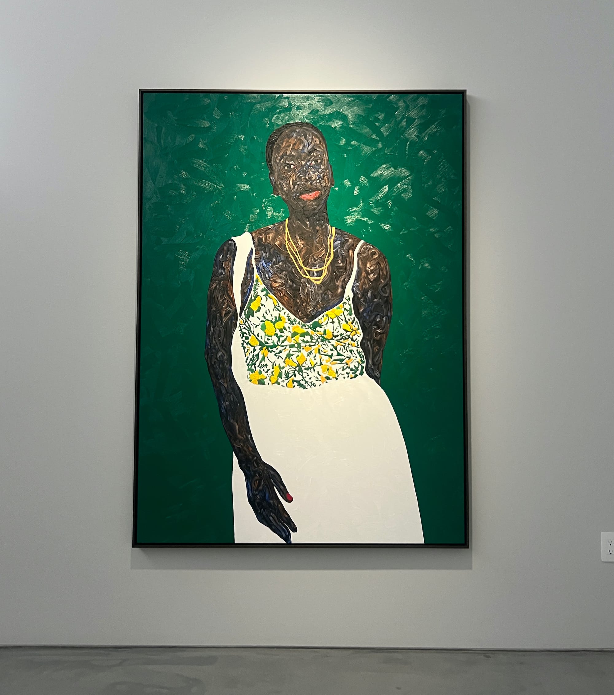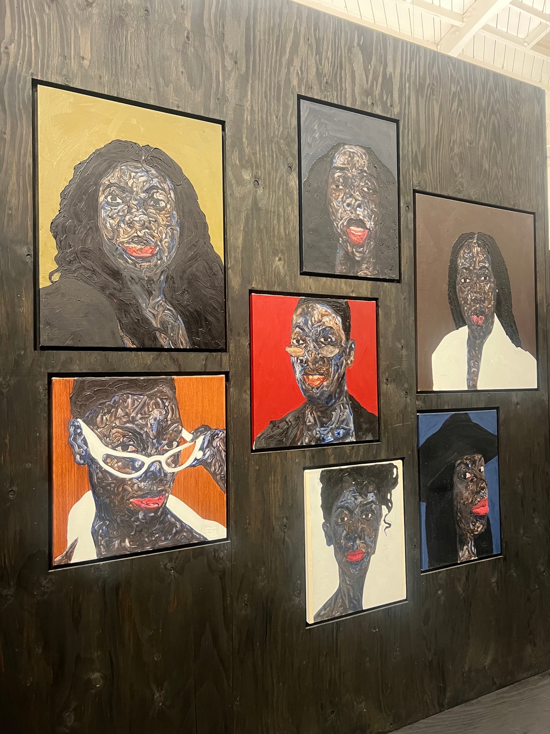 This exhibition features some firsts for Boafo’s US audience. It is the first time we’ve seen him incorporate embroidery into his portraits, adding dimension to his immortalized subjects. More notably, it is his first stateside partnership with Glenn DeRoche of DeRoche Projects, an Accra-based architecture and design firm. DeRoche produced a to-scale recreation of Boafo’s Accra studio within the Roberts Projects exhibition space. The intention was to utilize exposed Ghanaian teakwood, but turbulent international tariffs waylaid that plan. Instead, the structure is constructed of local plywood painted black. I visited the show twice — once for the press preview and again 12 days later. This second time, I was struck by how the atmosphere had transformed. Given time for the installation to breathe, a wooden, earthen musk permeated the gallery. Though I’m sure it’s not the scent of Ghana, it helped me to leave Los Angeles behind, to slow my breathing and receive the work differently.