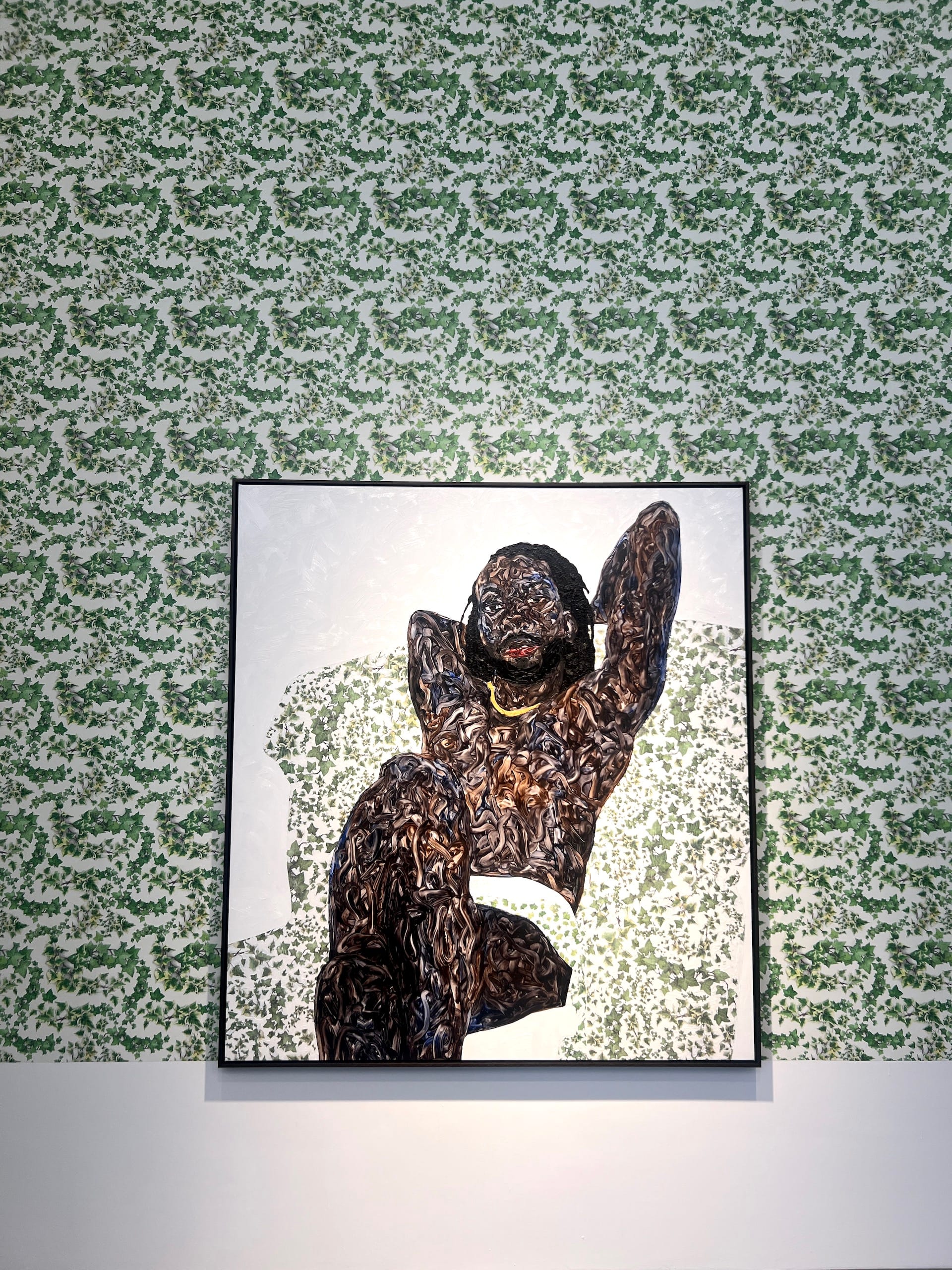 Dominating the show are regal portraits of femme subjects. From their frames flows a feminine resiliency and commitment to duty, place, people that enables simple rooms to become safe spaces, for groups to be transformed into community. I feel that Boafo is honoring that femme entity in homemaking — in the portraits of himself along with those of the others. Each work projects the willful act of welcoming to create a sense of home — particularly “Floral Shirt,” which looked over me while I eased into the living room, her face framed by voluminous hair, her swirled-finger-trail-skin coming across as 3D as she kept me company on the couch. Shifting my gaze, I found a wall of seven other women doing the same: meeting my eyes and acknowledging my presence in their world.