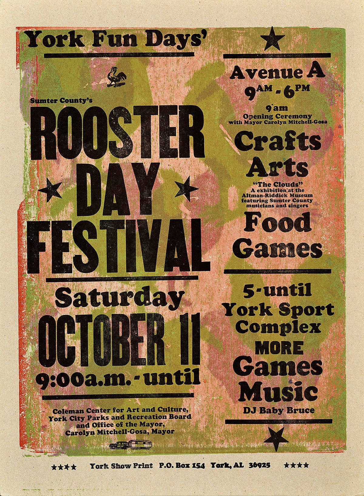 - Starting in 2002, York, Alabama began hosting a Rooster Day Festival, an annual free event focusing on arts and cultural activities.