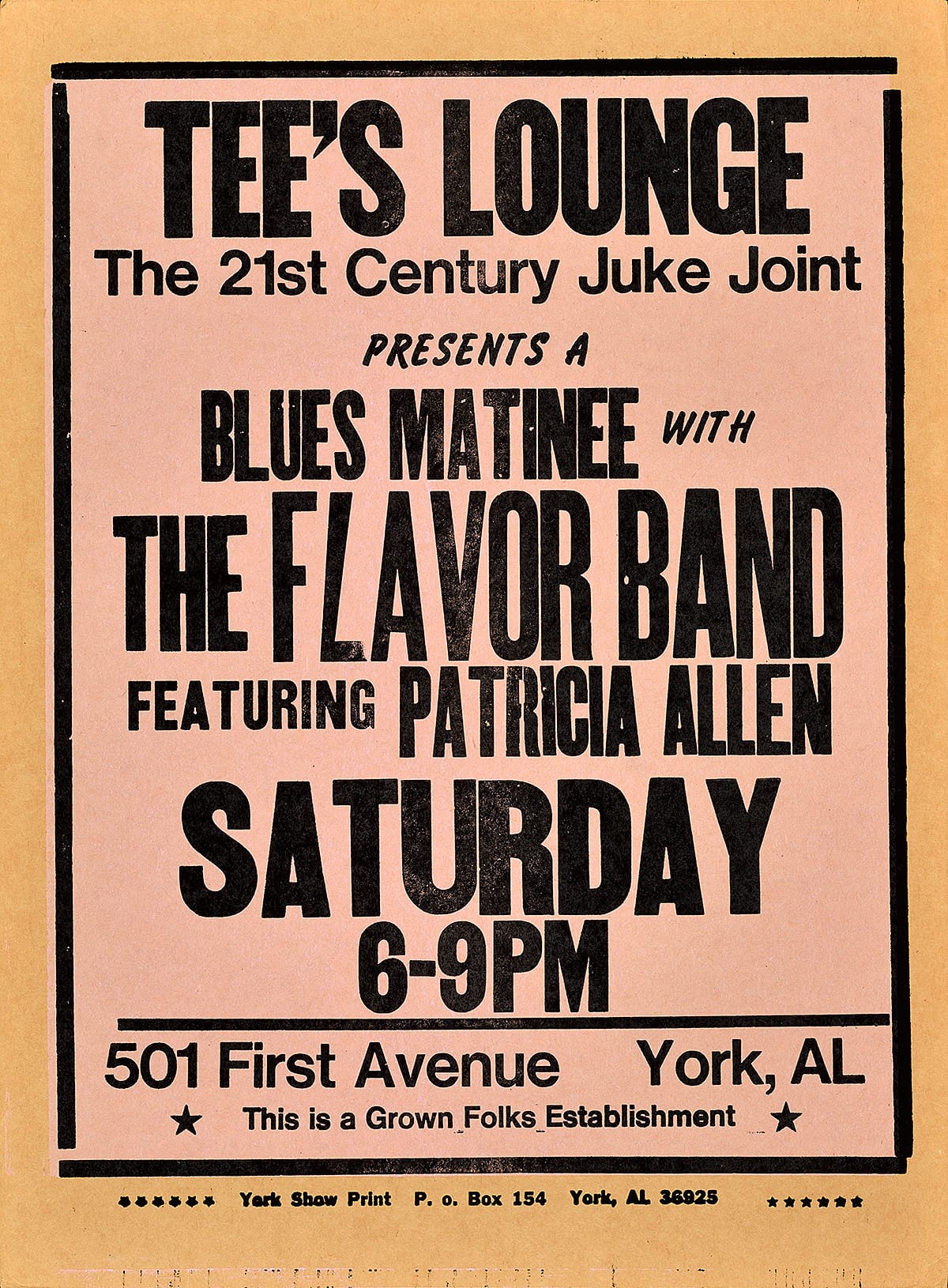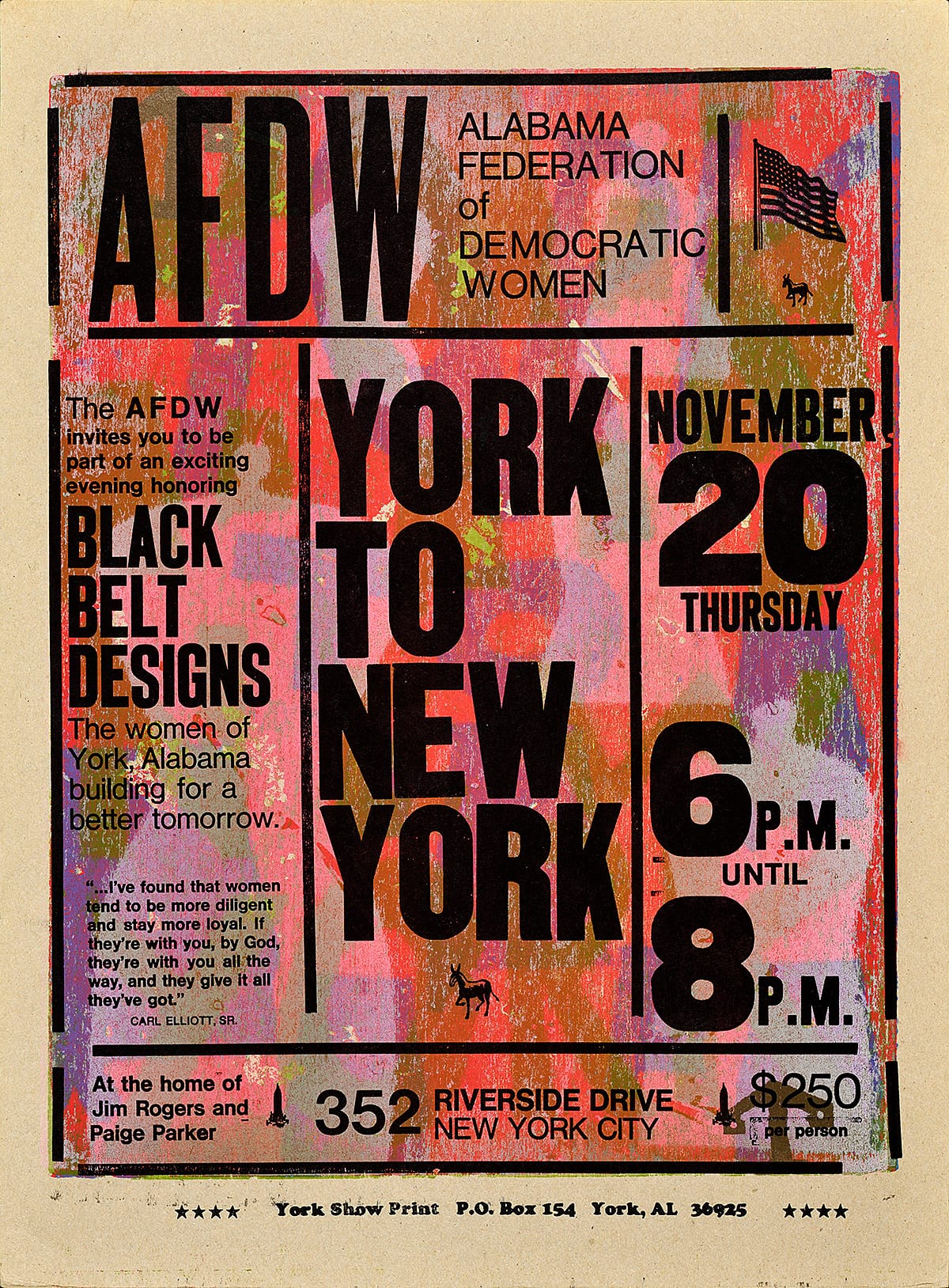 - This poster is for a private fundraising event in New York City benefitting the Alabama Federation of Democratic Women. The host, a prominent financier, had ties to York, Alabama, thus bridging York and New York.
