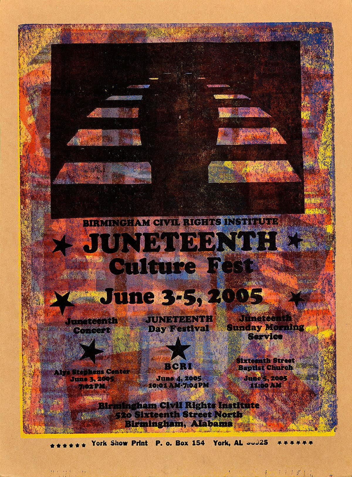 - The logo of the Birmingham Civil Rights Institute, the sponsoring organization for this three-day event, is repeated as a pressure print throughout the background in various sizes, providing multicolored visual texture to the composition.