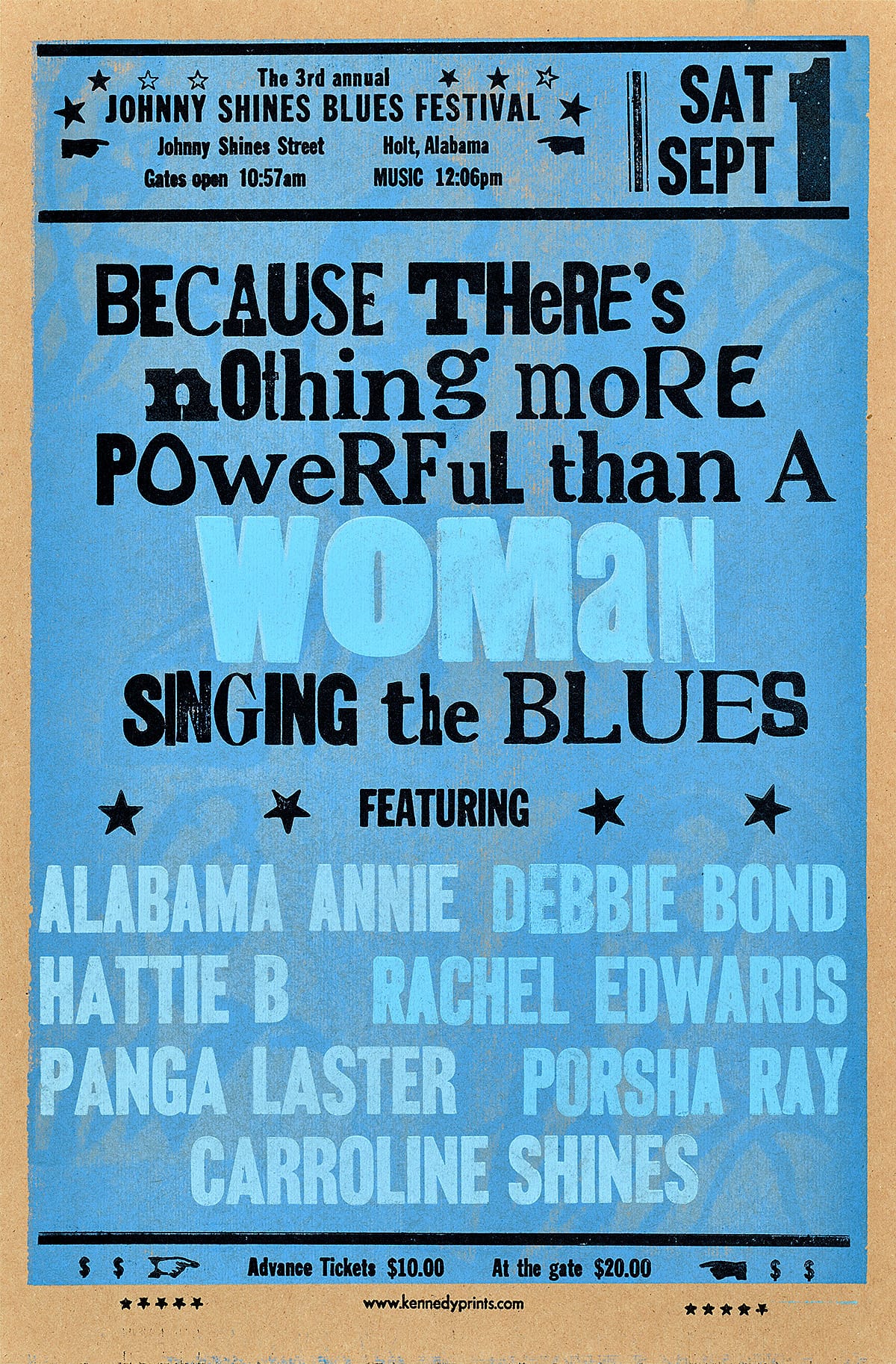 - This poster announces an all-female blues lineup as part of the Johnny Shines Blues Festival in Holt, Alabama.