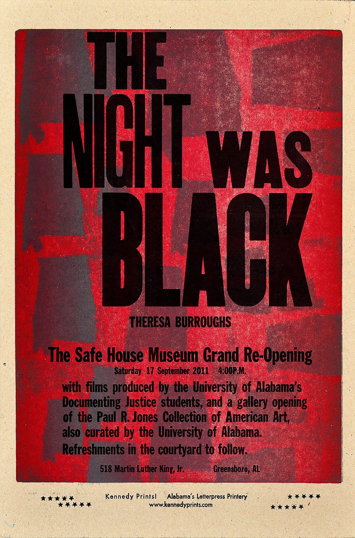 - This poster was created for the reopening of the Safe House Black History Museum in Greensboro, Alabama. The organization was founded in 1992 by Theresa Burroughs, a childhood friend of Coretta Scott King and participant in the Selma March over the Edmund Pettus Bridge.