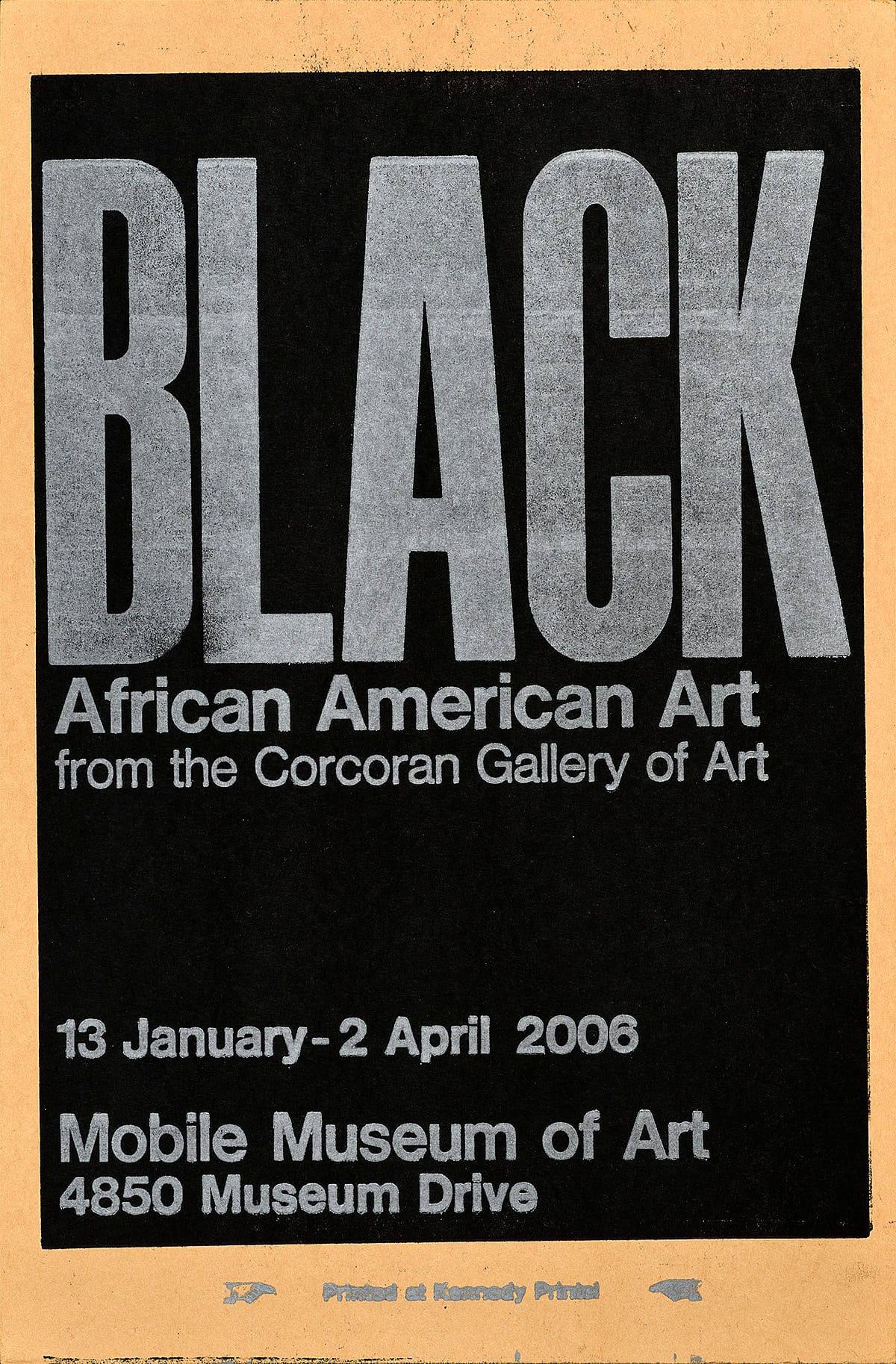 - This poster advertises the traveling exhibition Black Is A Color: African American Art from the Corcoran Gallery of Art, on view at the Mobile Museum of Art in Alabama.