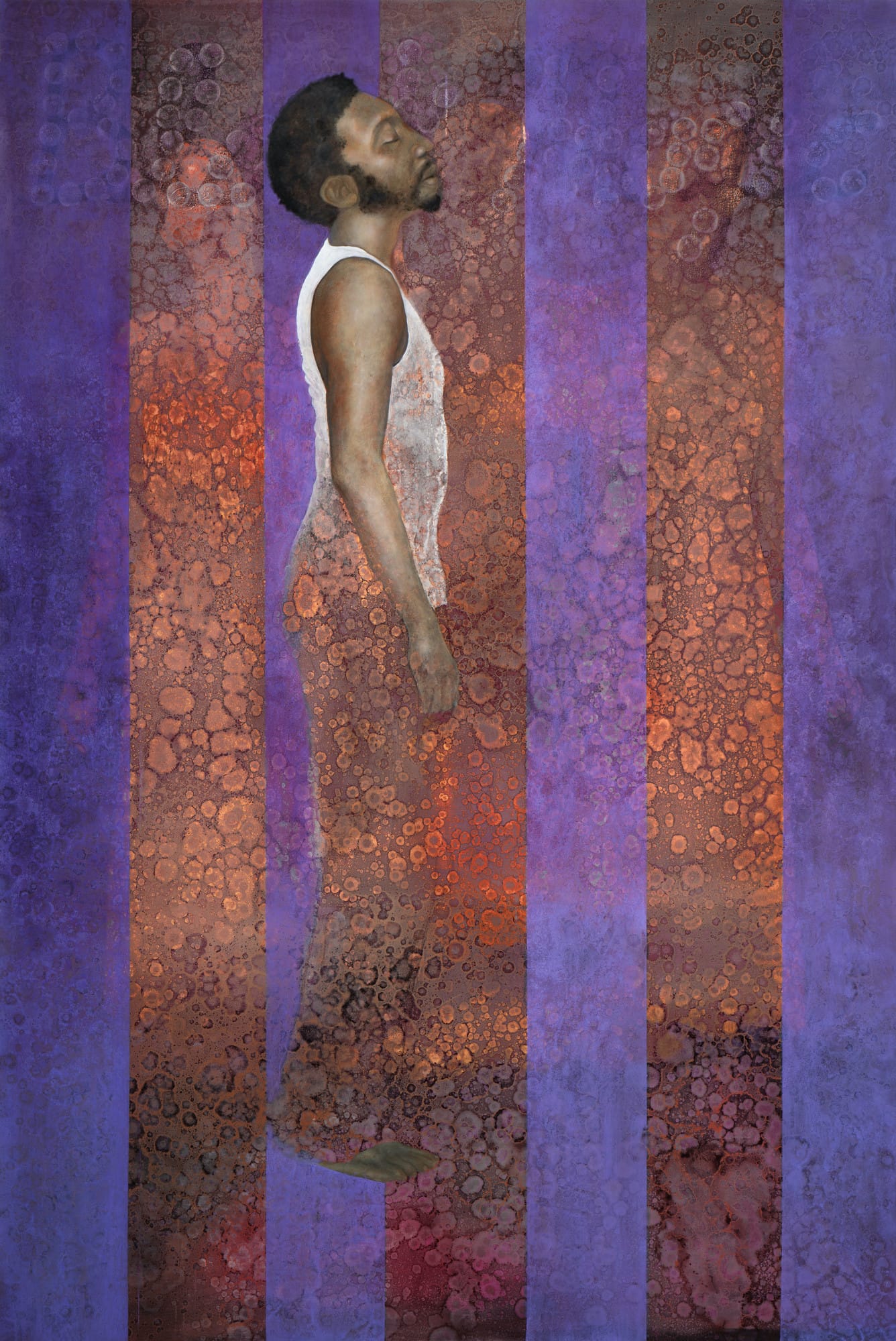 Still, her earliest painting, “Hangman” (2007), struck me immediately. A man's limbs mingle with Sherald’s distinctive splotches, created by turpentine drips, as he rises through the canvas, three watchful silhouettes barely visible in the background. Its metallic tones recall 12th-century crucifixion paintings, and its title clues you in to its historical reference point — the atrocities of Jim Crow lynch mobs. He appears peaceful, his eyes shut and neck extended toward the heavens. This is one of the only artworks on view where the subject’s eyes do not meet ours. It is a powerful refusal, a moment of reclaimed autonomy in the face of a wretched history. Taken together with the exhibition’s centerpiece, “Michelle LaVaughn Robinson Obama” (2018), the artist’s infamous painting of the nation’s only Black First Lady, we’re invited to contemplate the monumental journey of Black people in the United States.