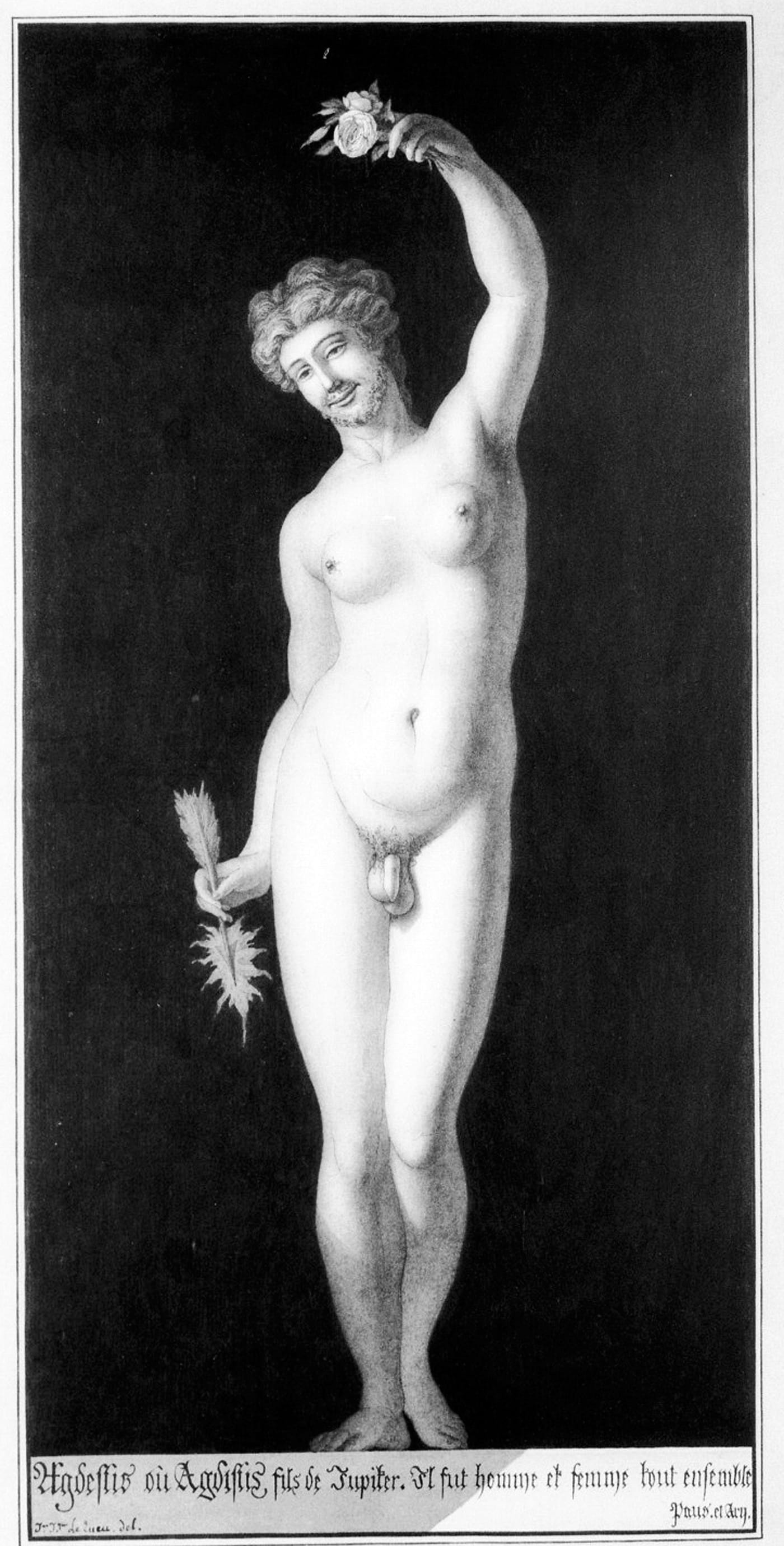 This space of depthlessly deep contradiction makes for an interesting display that mixes high culture, whimsy, and an almost perverse level of sexual detailing in several undated drawings. Whereas Boullée and Ledoux took a planetary perspective, in his late-drawings Lequeu turned inward: depicting the complexity of human sexual organs annotated with beautifully handwritten notes. With the drawing of the hermaphrodite deity “Agdistis” (1795–1779) and his cross-dressed “Self-Portrait” (1773), he also dabbled in impish images of pan-sexuality and tranvestism: a turn that gives his works a flippant and immodest, yet obsessive quality very different from the depersonalized detachment of his older arch-rivals.