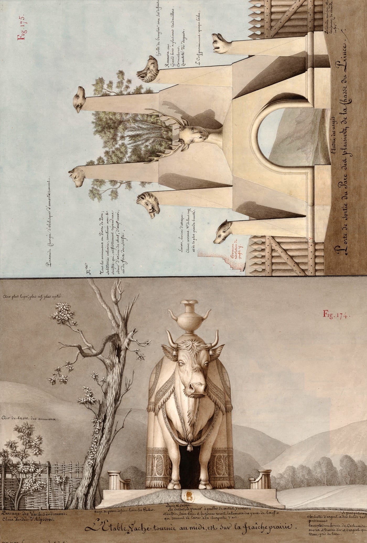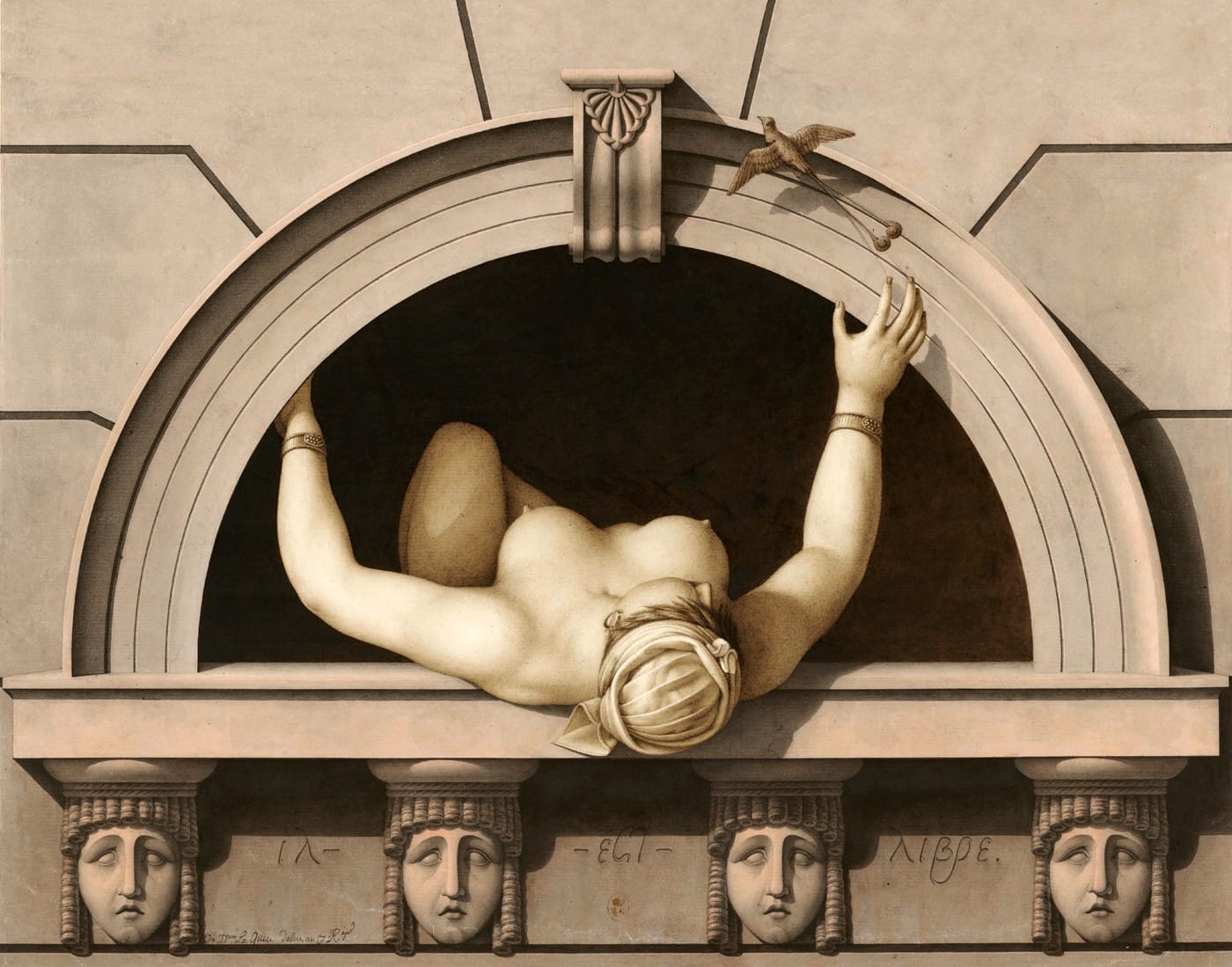 As a result of the revolution, he was merely able to secure a civil servant position, working as a surveyor and a cartographer (employed in various government offices as a draftsman) in the cadastre. He went largely unnoticed, even while spending his artistic energy preparing a vividly illustrated book he called Architecture Civile — which was never published. For it and himself alone, he produced this wealth of highly skilled drawings of strange scenes, like “And We Too Will Be Mothers; Because… !” (1793–1794); the aforementioned flamboyantly scrutinized body parts, like “After Nature” (1795–1779); a series of grimacing faces; and fantasy architectural component parts, like the bird-freeing cri de coeur, “He is Free” (1798–1799) and “The Exit Door of the Pleasure Park (above) and Cow Stable (below)” (1795–1779) — a building shaped as a giant Assyrian or Indian bovine designed to be a cow shed. How post-modern avant la lettre (by centuries) was that? He anticipated the significant Robert Venturi architectural form of duck architecture, defined in Venturi’s 1972 breakthrough book Learning from Las Vegas.
