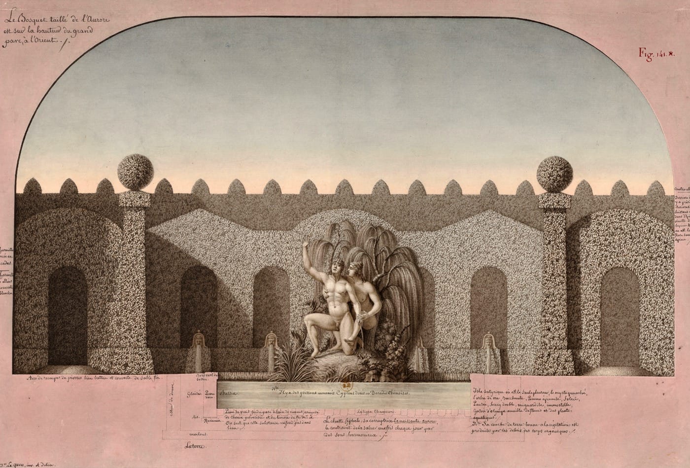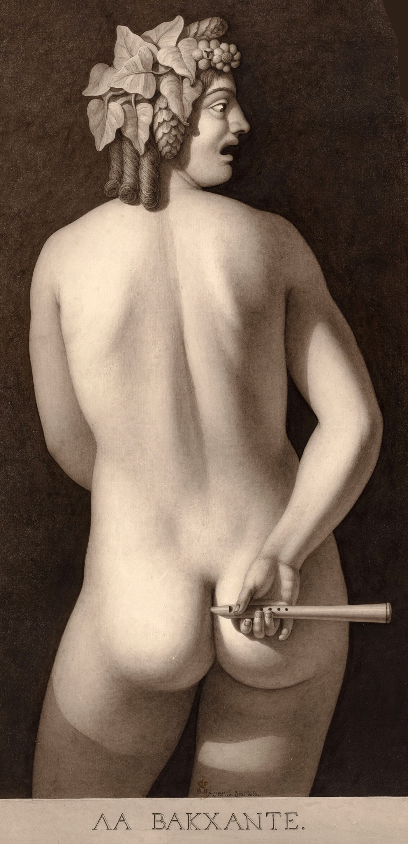 Lequeu also drew unabashedly lovely make-believe rooms unsparing in their immensity of minutiae, such as “Hotel Montholon (Salon Project)” (1785) and the “Temple of Earthly Venus: Boudoir” (1795–1779). Both hedonistic architectural projects are signifiers of the overindulgence of a bilious, vanished age and yet testify to Lequeu’s drawing dexterity, cultural erudition, and voluptuous obsessiveness. Other less energetic drawings are simpler but straight-up proto-Surrealist weird, like “The Bacchante” (1795–1779) that puts Dionysian nymph ecstasy under the cool eye of a satirist surveyor. It is difficult to tell if he is devil-may-care lampooning or tauntingly glorifying here, since bacchantes are usually depicted as disheveled, wildly celebrating the mysteries of Dionysus-Bacchus. This one seems to be in the tranquil but distressed process of whistling out her ass a delightful tune on a flute.