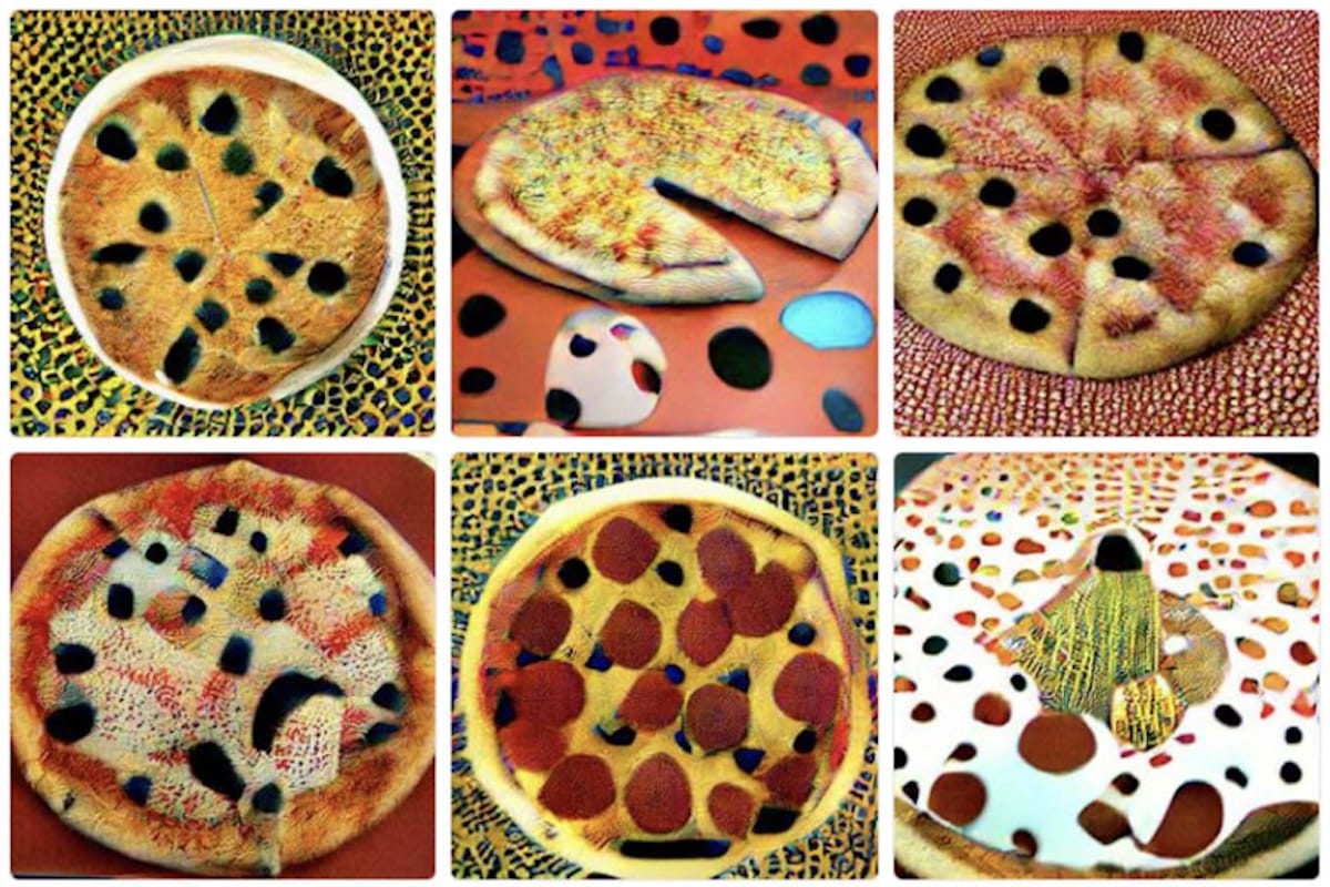 In fact, the only prompt that has thus far generated non-terrifying results is “Yayoi Kusama pizza,” conceived by Hyperallergic Editorial Coordinator Lakshmi Rivera Amin, which mostly resulted in pizzas with wildly patterned toppings or backgrounds that feel dazzling and inedible in the manner of cookbooks from the dawn of the color printing era.