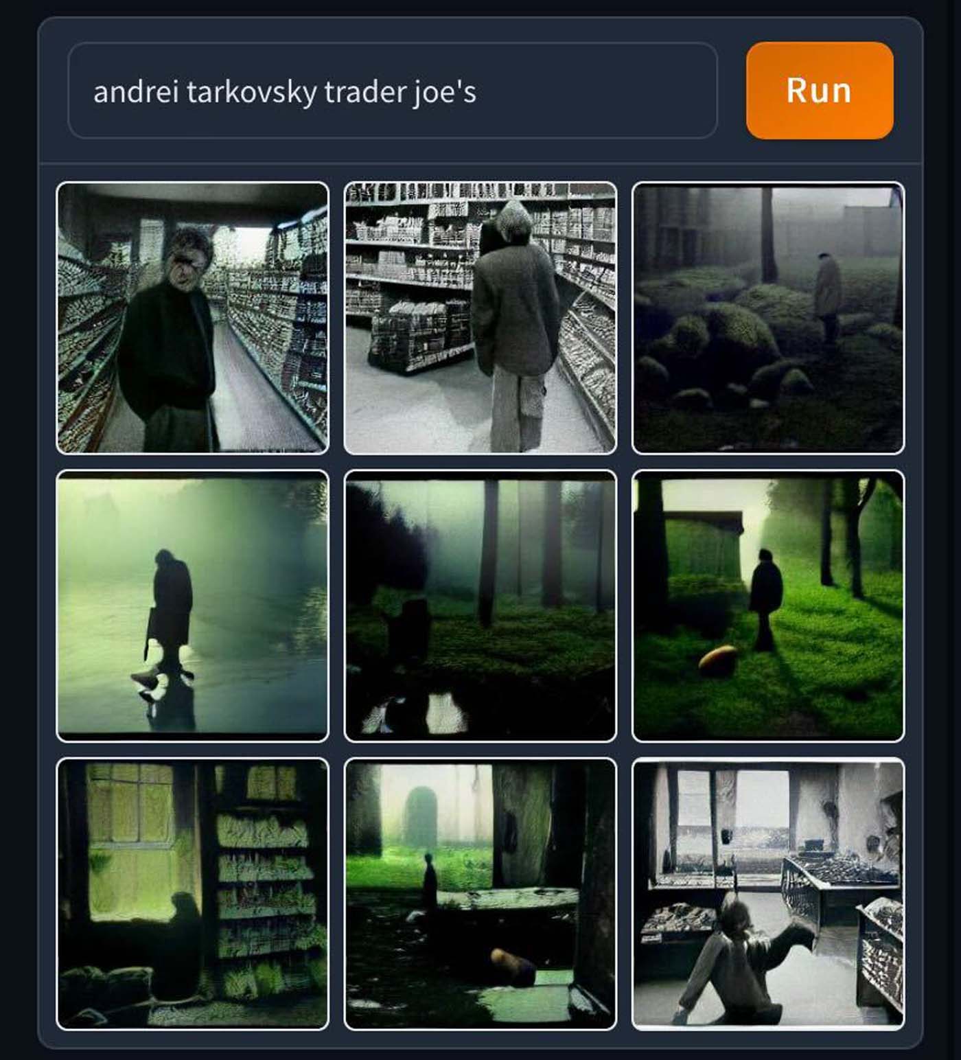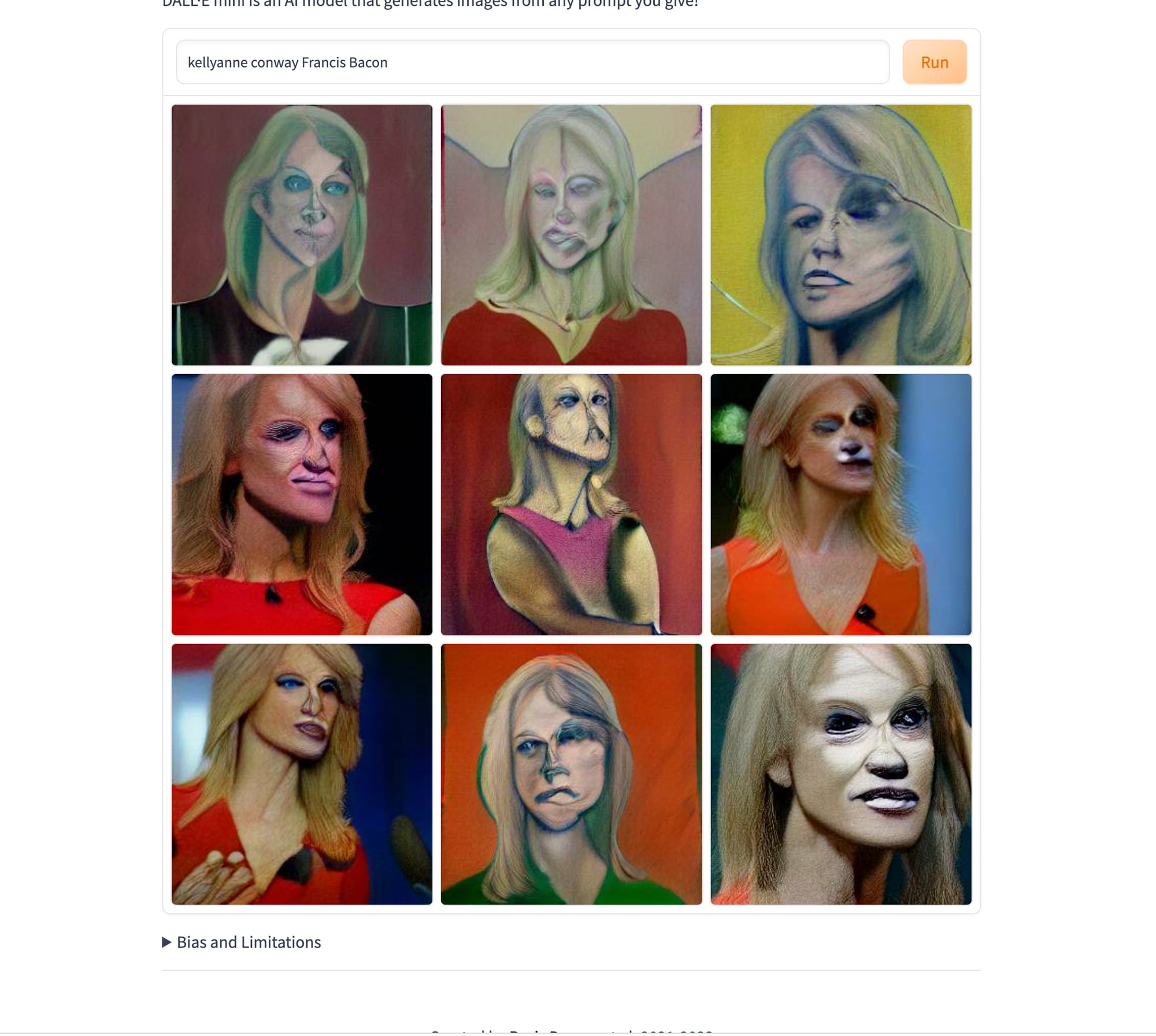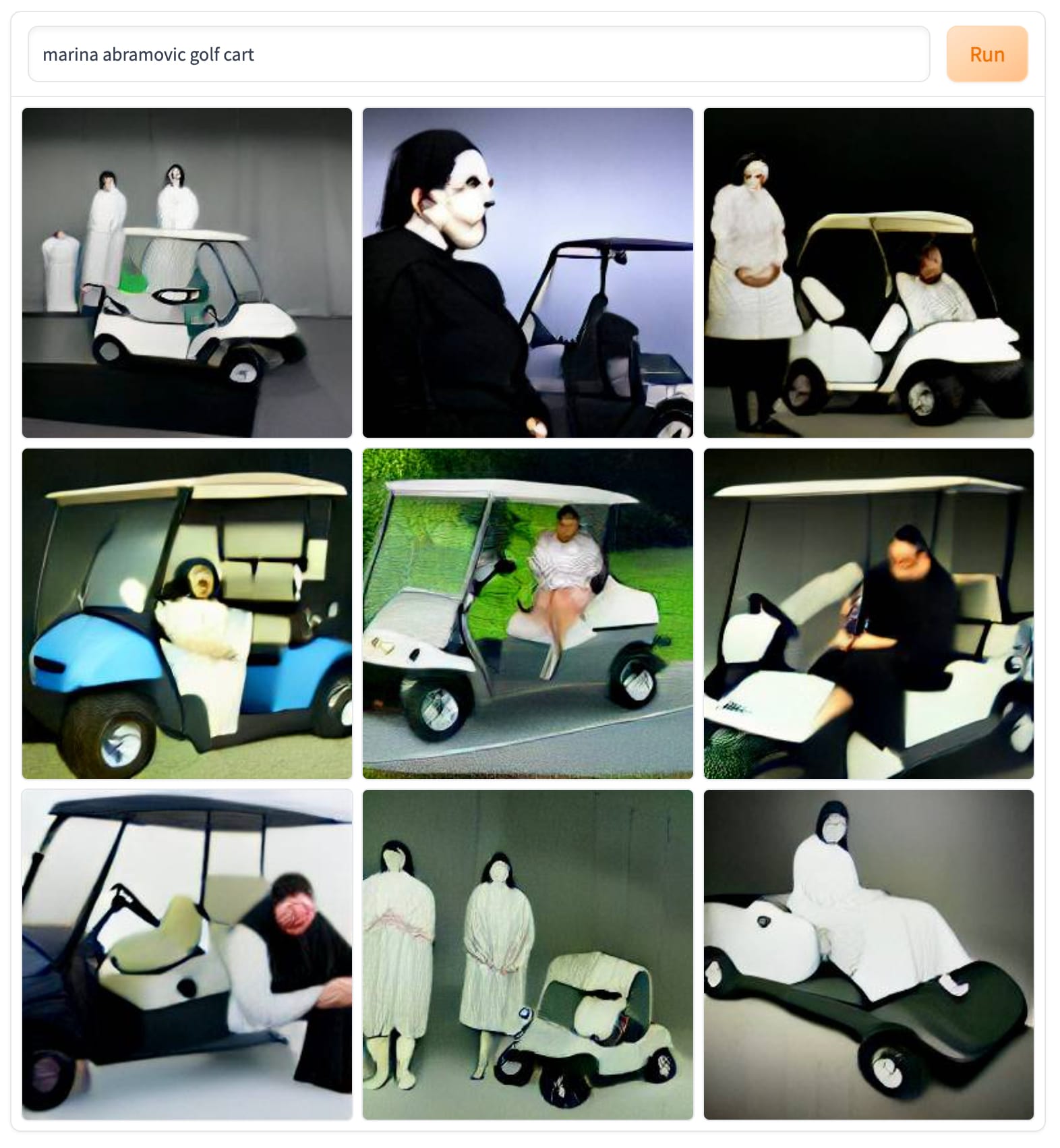 Meanwhile, back at the Hyperallergic office, real, mature, and important arts journalists produced a series of images based on the prompts “Andrei Tarkovsky Trader Joe’s,” “Marina Abramović golf cart,” and “Kellyanne Conway Francis Bacon.” In response, DALL-E Mini generated image grids that look like a lost clips reel from “Archive 81,” some kind of Korean horror film involving people with non-faces invading a golf course, and what would happen if you took acid while watching Fox News, respectively. Are these images that needed to be in the world? Emphatically, no!