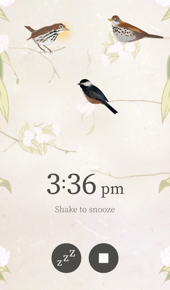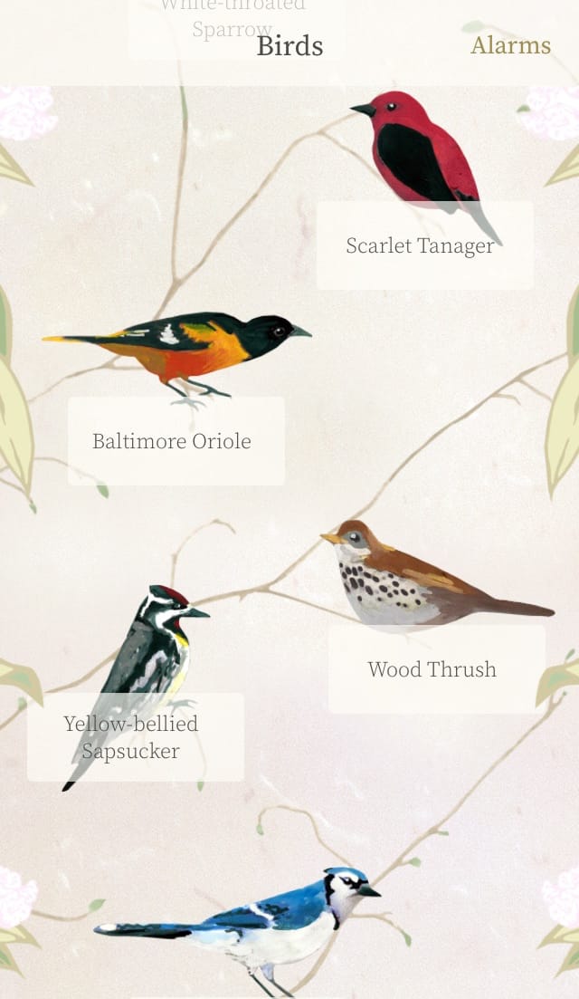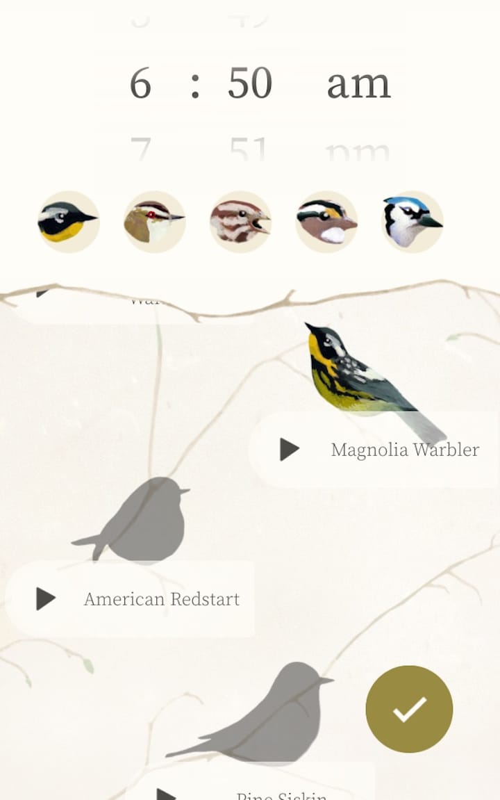 I’ll admit I was a little wary of how successful bird chirps would be after years of awaking to noises that bring to mind impending doom, but using Dawn Chorus actually hasn’t made me late for work (yet). You’re still able to select snooze to afford yourself extra beauty sleep, in 10-minute increments; being able to customize (dare I say, curate?) which birds you want to hear is also a neat way to structure your personal wakeup routine. A combination that works well for me is to kick off with the melodic chirps of the Magnolia Warbler — peaceful, but still sharp enough to jolt me from sleep — and build up in intensity to the Blue Jay, which squawks, somewhat annoyingly. Still, its natural vocals sure beat the robotic bleeting of my alarm clock.